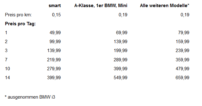 Der Mietprozess bleibe jedoch gleich. Das jeweilige Paket wird im Auto ausgewählt. Anmietung und Rückgabe sind nur im Geschäftsgebiet möglich, der Treibstoff ist im Tarif inkludiert. Der Mietpreis besteht aus zwei Komponenten: einem Basispreis und einer Kilometer- und Treibstoffpauschale. So fallen laut dem Unternehmen für eine zehntägige Miete eines Kleinwagens der Marke smart etwa 27,99 Euro Basispreis an. Dazu würden 0,15 Euro Pauschale pro gefahrenem Kilometer kommen.