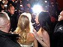 Schon die wenigen Meter vom Auto zum rettenden Eingang in die Oper entpuppten sich als Spießrutenlauf. Mit blankem Entsetzen im Gesicht versuchte sie, spärlich abgeschirmt von Bodyguards, unbeschadet ihren Weg in die Oper zu finden. Ernste Sorgen machte sich die Schauspielerin auch um ihr beigefarbenes Kleid: “My dress, my dress!”, stöhnte sie, als ihr immer wieder Fotografen auf ihren Saum traten. Abgerundet wurde das bizarre Spektakel von einem Zaungast, der mit Lugner-Maske vor dem Gesicht vor Sheridan auf und ab sprang und rief “Ich bins, der Richie”.
