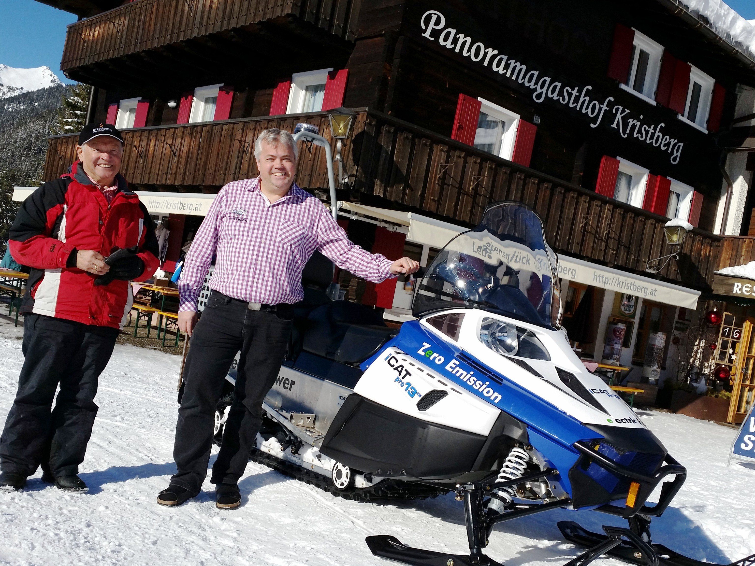 Er hat sich mit seiner Familie das erste Elektro-Skidoo in Vorarlberg angeschafft und kann sich des Interesses an dem Wunderding kaum erwehren. Selbst der bald 76-jährige, ewig-jung-agile, Adolf Zudrell schwingt sich mit Leichtigkeit auf die neue Leidenschaft und “muss noch schnell” Gäste von der Kristbergbahn holen – Wintertaxiservice auf Kristberg-Art.