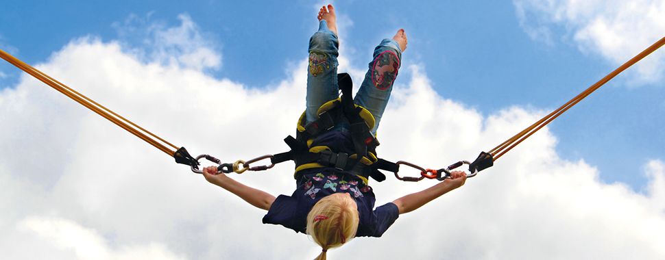 Völlig losgelöst mit dem Bungee-Trampolin geht es nach Lust und Laune immer höher. Mit dem richtigen Schwung gelingen auch Überschläge und Saltos. Vor allem Kinder begeistert das schwerelose Körpergefühl.