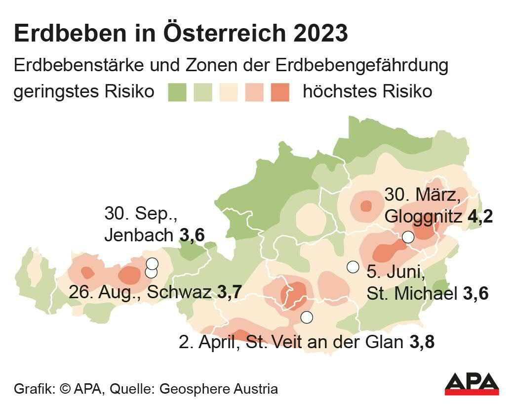 2023 ereigneten sich in Niederösterreich 39 Erdbeben, die von der Bevölkerung wahrgenommen wurden. Dieser besonders hohe Wert ist auf eine außergewöhnliche Erdbebenserie bei Gloggnitz zurückzuführen. An zweiter Stelle liegt die Steiermark mit zwölf spürbaren Ereignissen. Danach folgen Tirol und Kärnten mit jeweils elf spürbaren Erdbeben. In Oberösterreich ereigneten sich drei verspürte Erdbeben, im Burgenland eines.