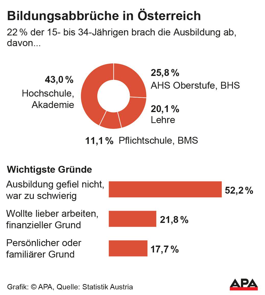 Den größten Anteil unter den Ausbildungsabbrüchen und -wechseln machen Hochschulstudien aus (43 Prozent), vor allem im Bachelor. 26 Prozent entfallen auf die AHS-Oberstufen oder berufsbildenden höheren Schulen (BHS), ein Fünftel aller Abbrüche bzw. Wechsel findet in der Lehre statt. Als Grund für den Abbruch bzw. Wechsel nannten 52 Prozent, dass die Ausbildung nicht ihren Vorstellungen entsprochen hatte oder dass sie zu schwierig war. An den Hochschulen nannten das sogar 63 Prozent als Motiv. Mit deutlichem Abstand folgt der Wunsch, lieber arbeiten zu gehen bzw. finanzielle Motive.