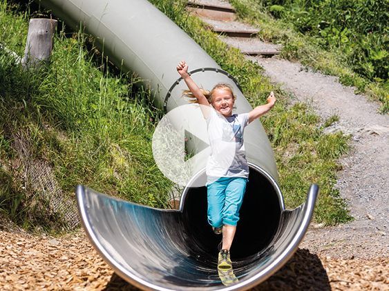 Wandern und Rutschen, die perfekte Kombination für einen unvergesslichen Ausflug! Die sieben Rutschen mit einem Durchmesser von 80 cm und einer maximalen Länge von 65 m verkürzen hier auf eine tolle Art und Weise den Abstieg ins Tal.