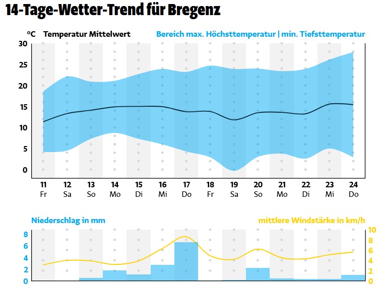 Durch zunehmenden Föhneinfluss steigen die Temperaturen besonders im oberen Rheintal und im Walgau auf frühsommerliche Werte zwischen 19 und 24 Grad.