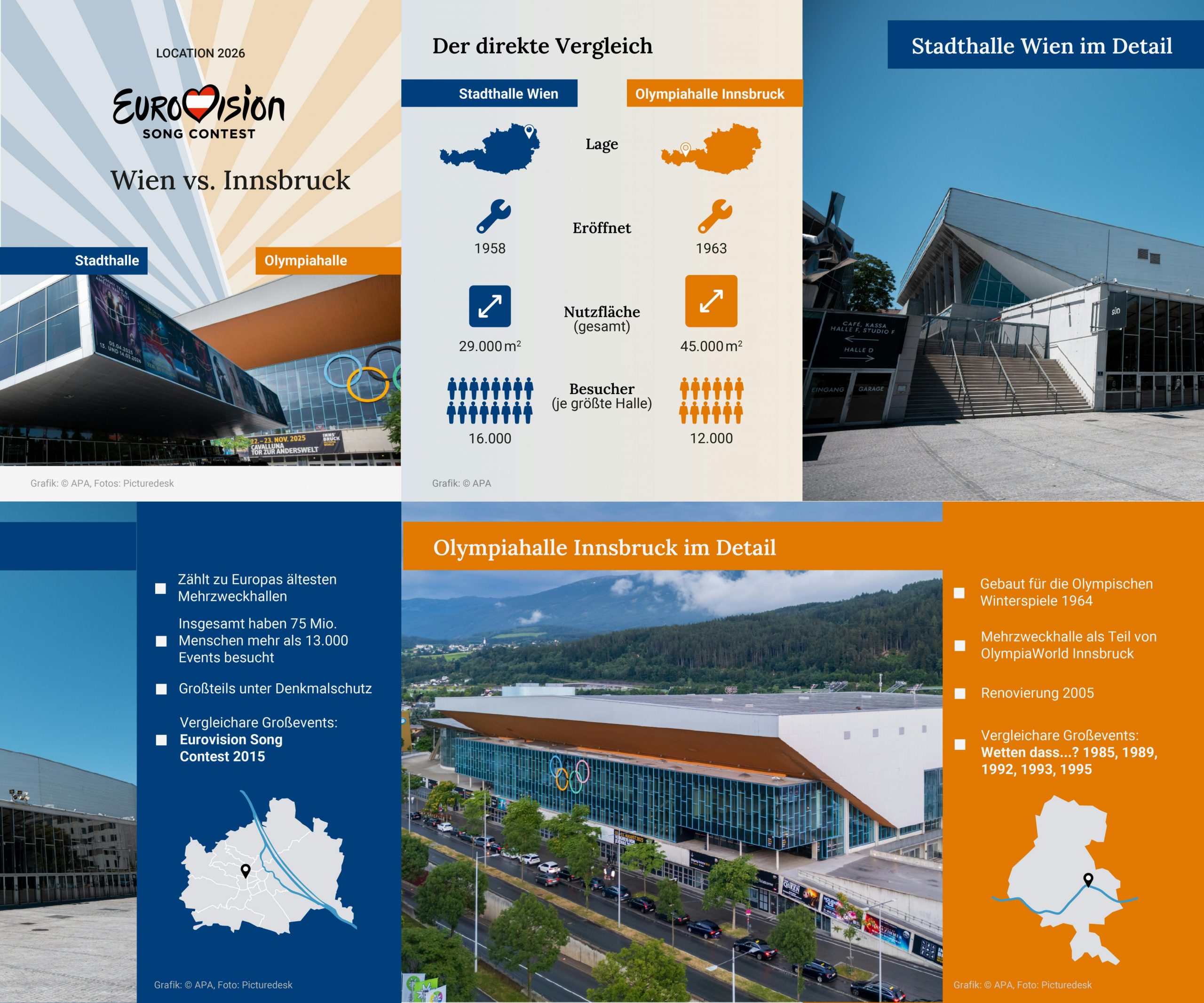 Deutlich früher feststehen wird indes, ob das musikalische Großevent in Wien oder Innsbruck ausgetragen wird. Die Verhandlungen zwischen den beiden Bewerberstädten, die mit der Stadthalle respektive der Olympiaworld als Venue ins Rennen gehen, sind abgeschlossen, nun harrt die ESC-Welt der Entscheidung des ORF. ORF-ESC-Executive-Producer Michael Krön hatte gegenüber der APA zuletzt von einem "offenen Rennen" gesprochen.