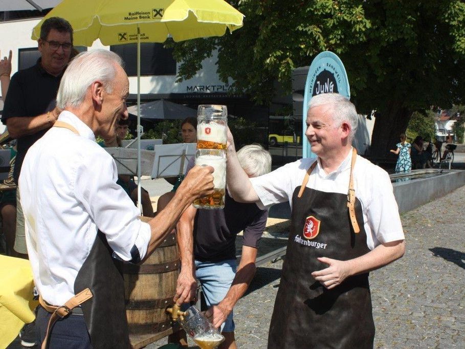 13.09.2023 Hunderte sahen beim Rankweiler Pfarrfest am Marktplatz den neuen “Brauerei-Mitarbeitern” Walter Juen und Peter Loretz zu.