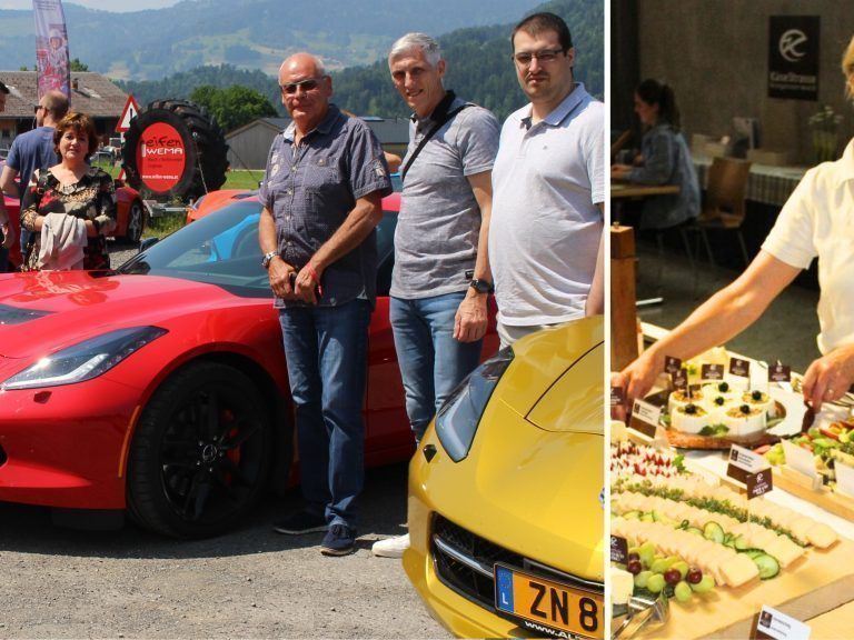 19.06.2023 Wenn Corvette auf Käse trifft: Sportwagen-Enthusiasten erkundeten den Lingenauer Käsekeller und parken ihre glänzenden Karossen vor dem Eingang.