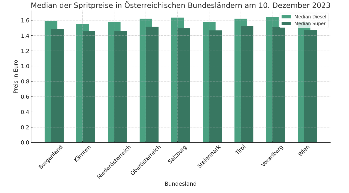 Am 10. Dezember 2023 zeigen die aktuellen Daten der E-Control interessante regionale Unterschiede in den Preisen für Diesel und Superkraftstoff. Laut den neuesten verfügbaren Daten vom 10. Dezember 2023 variieren die Spritpreise in Österreich erheblich von Bundesland zu Bundesland. Bei Diesel liegt der Medianpreis zwischen 1,549 Euro in Kärnten und 1,644 Euro in Vorarlberg. Interessanterweise ist der Medianpreis für Diesel in Vorarlberg am höchsten.