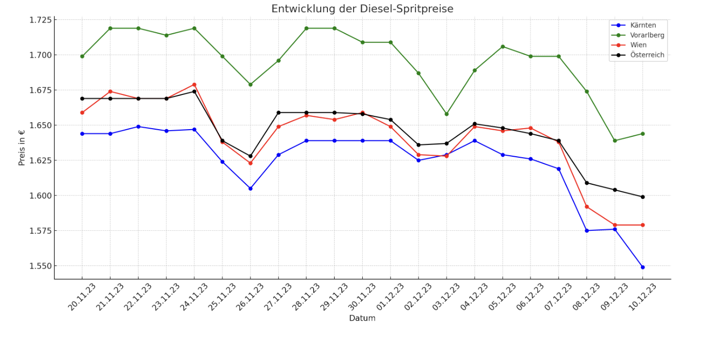 - In Vorarlberg hat der Preis für Diesel seit dem 20. November von 1,699 Euro auf 1,644 Euro am 10. Dezember gesunken. Dies entspricht einem Rückgang von 0,055 Euro.