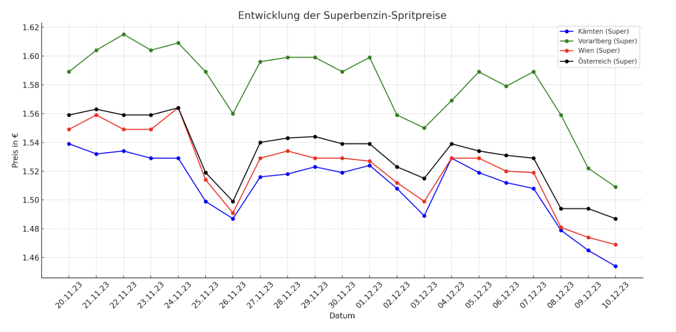 - Im österreichweiten Durchschnitt lag der Preis für Super am 20. November bei 1,559 Euro und sank bis zum 10. Dezember auf 1,487 Euro. Dies entspricht einem Rückgang von 0,072 Euro.