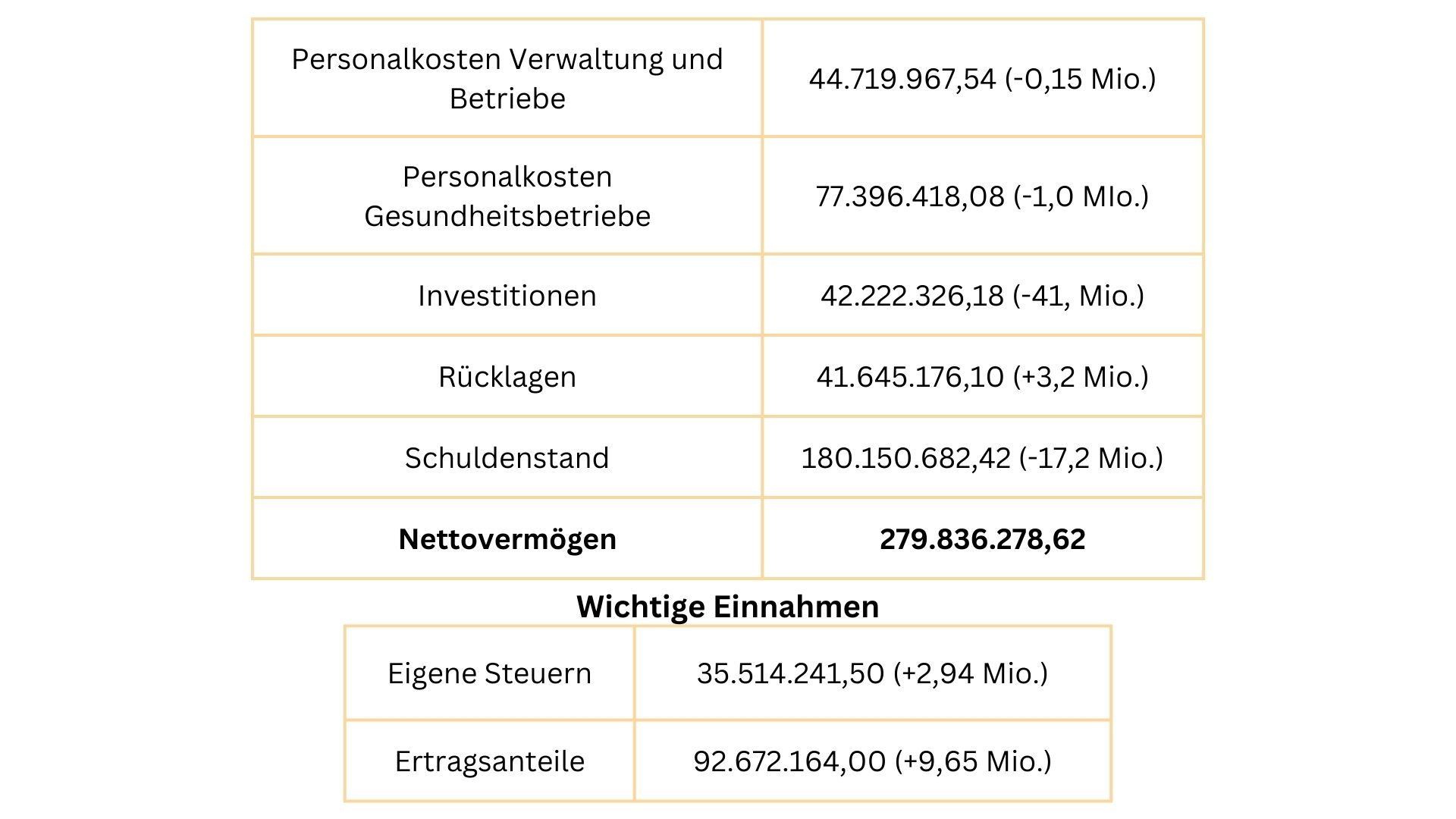 Dazu gehören die Investitionen der Stadt in den Ausbau und die Instandhaltung der Infrastruktur, aber auch in Projekte zur Verbesserung der Lebensqualität. "Allein rund 42,2 Millionen waren es im vergangenen Jahr, rund 3 Millionen mehr als im Jahr 2021", so Kaufmann. Die größten im Vorjahr umgesetzten Projekte waren der Wiederaufbau der Ausweichschule, der Neubau der Rappenlochbrücke, der Ausbau von sieben neuen Photovoltaikanlagen oder die Modernisierung im Krankenhaus, beispielsweise die Sanierung und Neugestaltung der Geburtshilfe. Für den laufenden Betrieb von Schulen, Kindergärten und Kinderbetreuung wurden 22,5 Millionen Euro investiert.