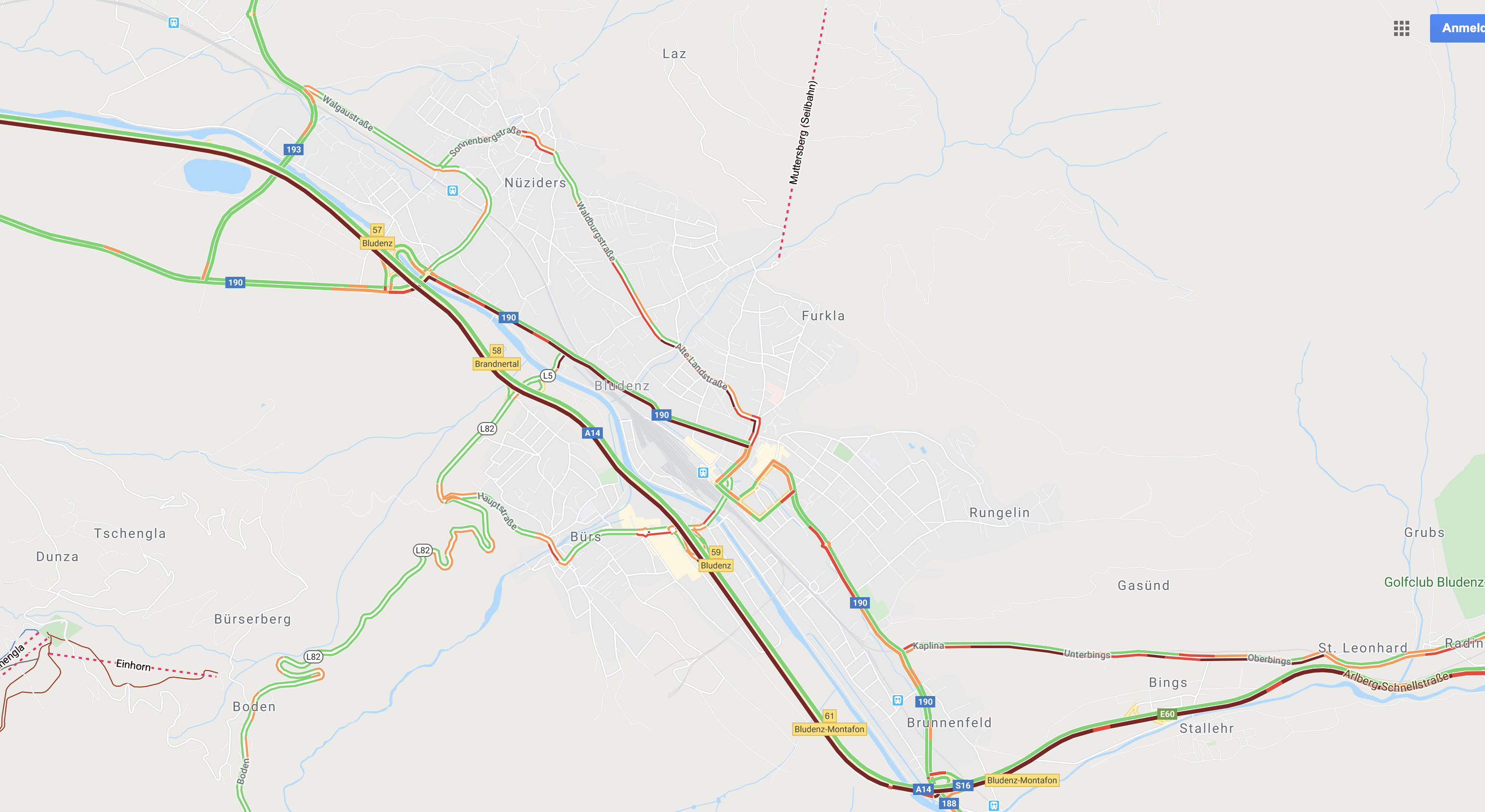 Die Stausituation in und um Bludenz am späten Samstag Vormittag. Es staute sich von Nenzing bis ins Montafon. In und um Bludenz waren sämtliche Verkehrswege, A14, Bundesstraße, Landstraßen verstopft. ©Google Maps