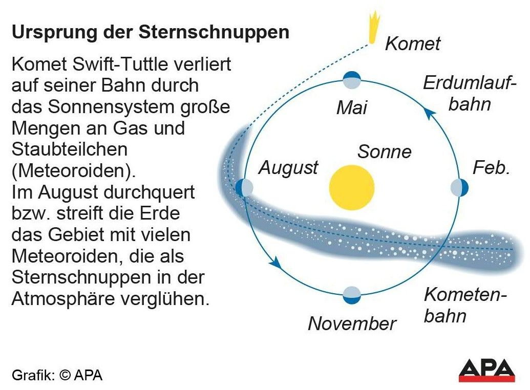 Jedes Jahr kreuzt die Erde die Bahn des Kometen Swift-Tuttle, der Staubspuren hinterlässt. Bewegt sich die Erde nun in diesen Staub, treffen feinste Sandkörner mit höchster Geschwindigkeit (bis zu 50 Kilometer pro Sekunde) auf die Erdatmosphäre und verglühen. Das nehmen wir dann als Sternschnuppen wahr.