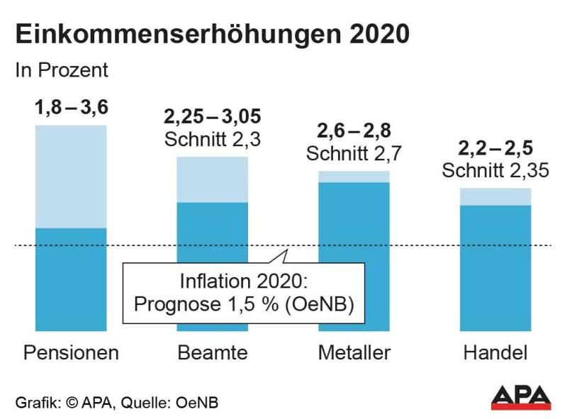 Die Arbeitnehmer erhalten Lohnerhöhungen über der (laut OeNB) 1,5-prozentigen Inflationsrate, nämlich plus 2,7 Prozent bei den Metallern, 2,3 bei den Beamten oder 2,35 im Handel. Politiker bekommen 1,8 Prozent mehr. Für Pensionisten liegt die Erhöhung zwischen 3,6 und 1,8 Prozent. Für Langzeitversicherte wird die Hackler-Pension ohne Abschläge wieder eingeführt.