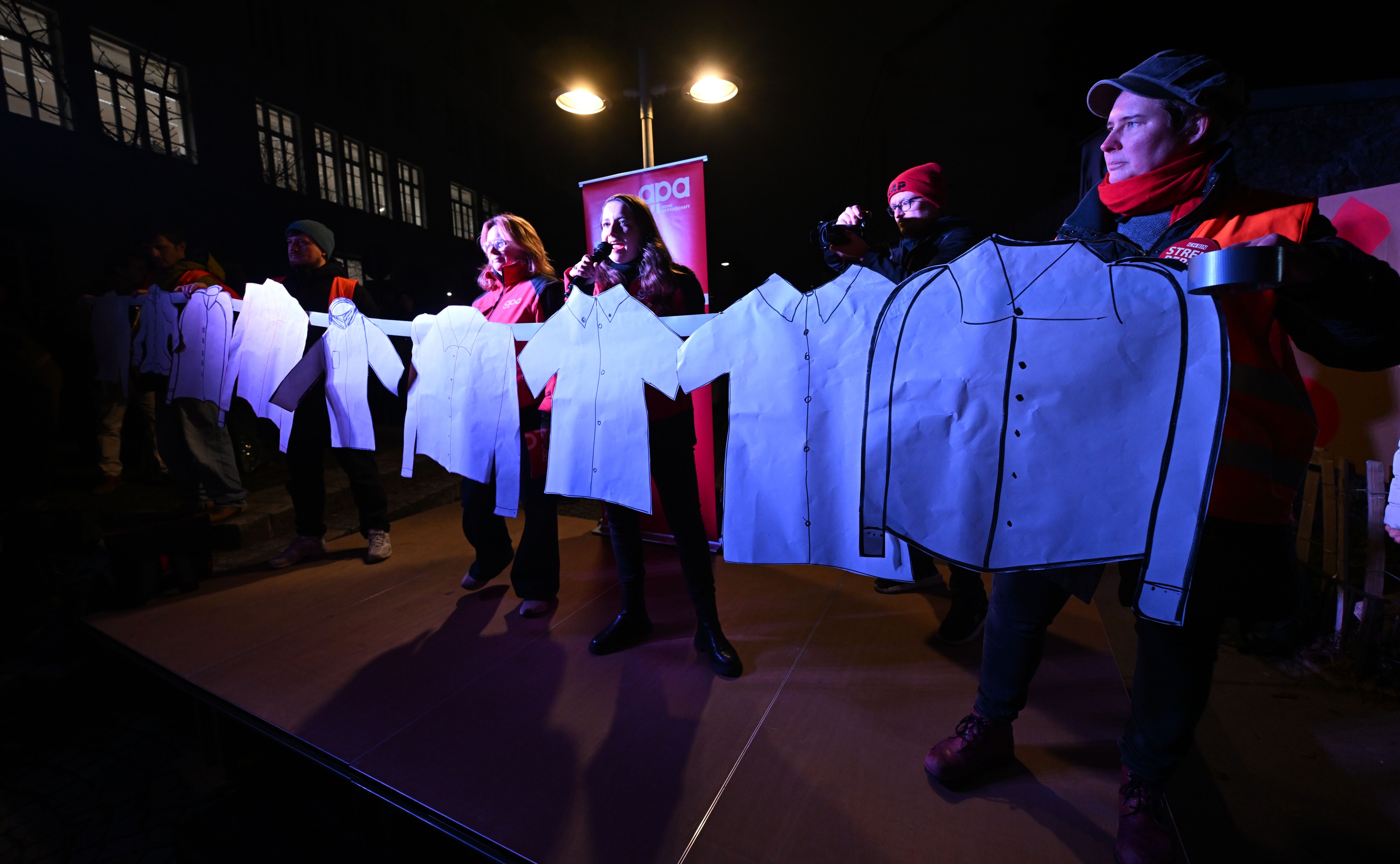 An der Demonstration im Ignaz-Kuranda-Park in Rudolfsheim-Fünfhaus nahmen einige hundert mit Leuchtstäben ausgestattete Beschäftigte in den privaten Gesundheits-, Sozial- und Pflegeberufen teil. Man hoffe, dass durch die "Lichter-Menge" den Arbeitgebern "ein Licht aufgeht", hieß es. Die stellvertretende GPA-Geschäftsführerin Carina Köpf wies unter Applaus erneut das Angebot der Arbeitgeber als "absolut inakzeptabel" zurück. vida-Generalsekretärin Anna Daimler sprach von "Lohnraub". "Wir sind streikbereit", skandierten die Beschäftigten.