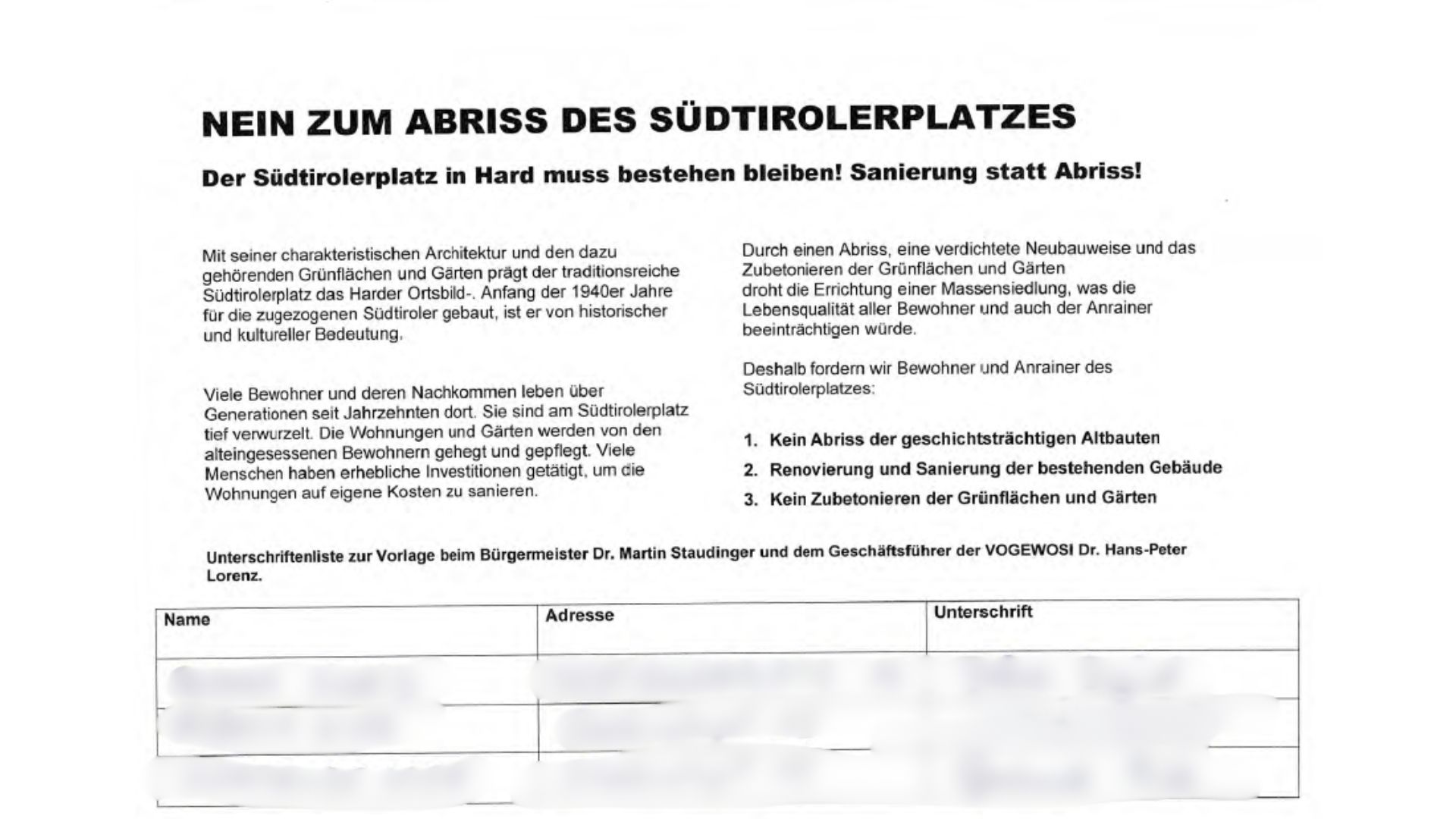 Nach dem VOL.AT-Bericht zur Südtirolersiedlung in Hard hat sich jetzt auch ein langjähriger Bewohner zu Wort gemeldet. Er verwies auf eine Unterschriftenliste.