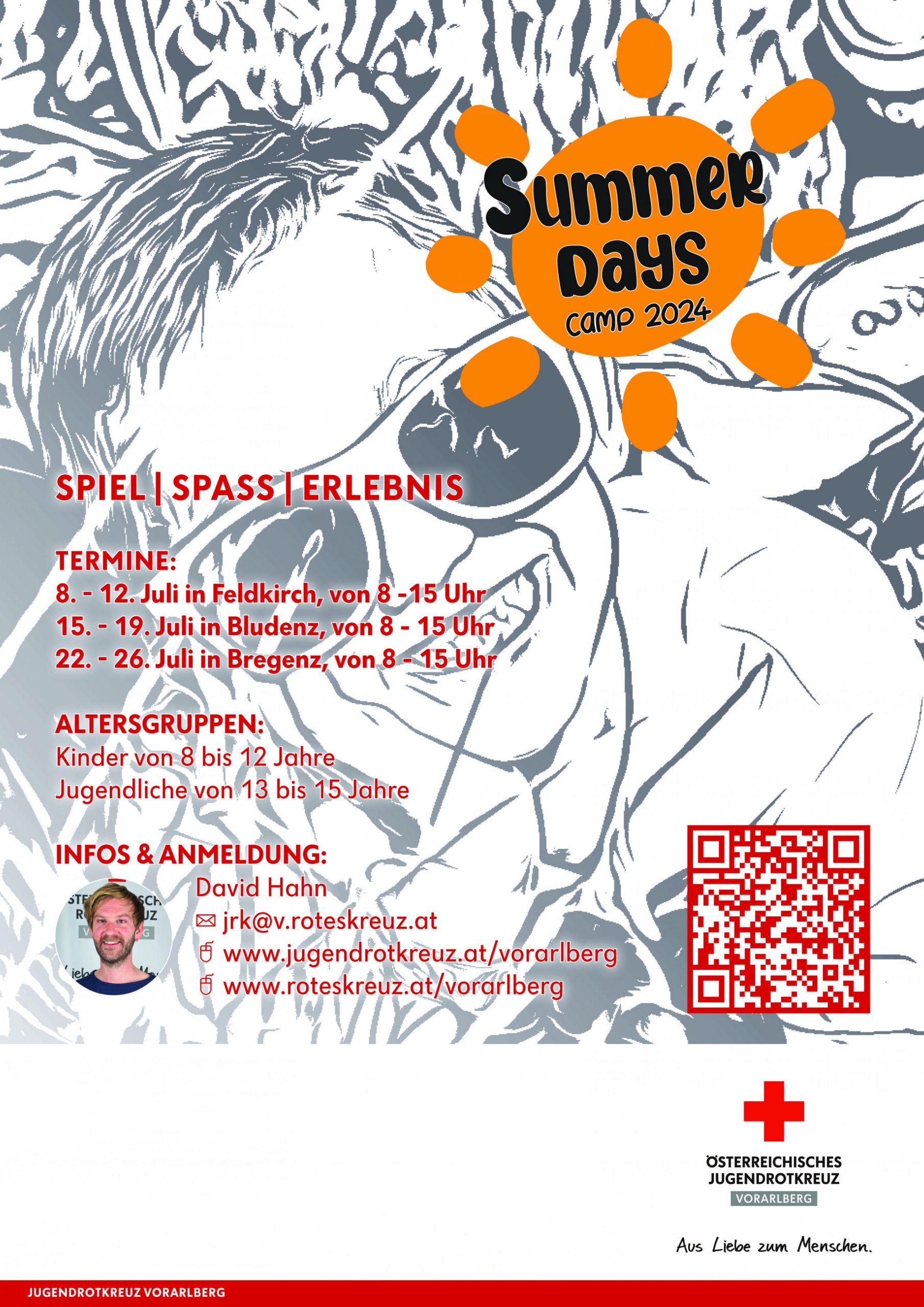 Nach der erfolgreichen Premiere im Jahr 2022 mischt das Jugendrotkreuz Vorarlberg auch 2024 beim sommerlichen Erlebnis- und Betreuungsangebot für Kinder und Jugendliche mit: Mit den „SUMMER DAYS CAMP 2024“ können Kinder und Jugendliche mit viel Spiel und Spaß und vor allem dem Erlebnis „Rotes Kreuz“ in die Sommerferien starten.