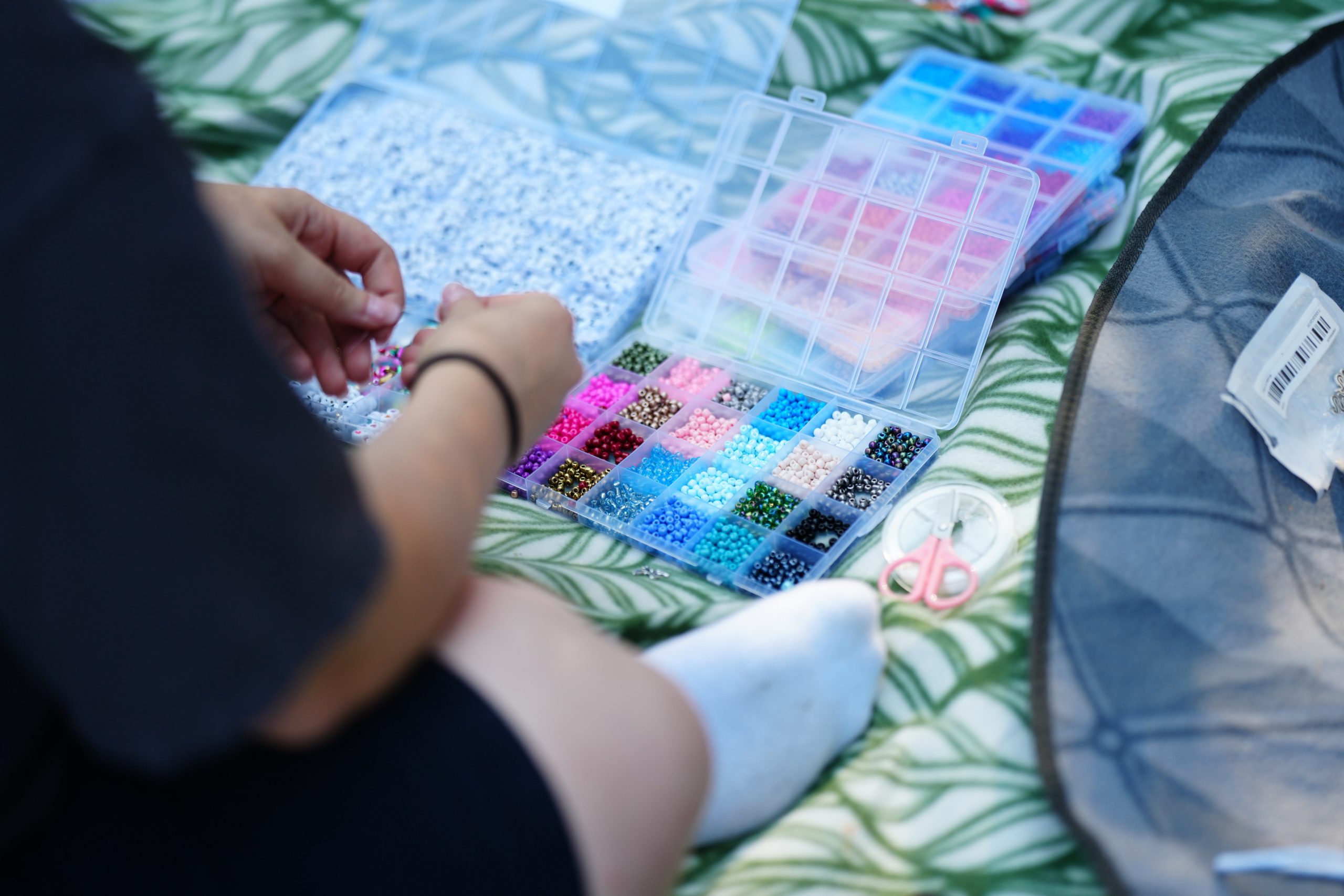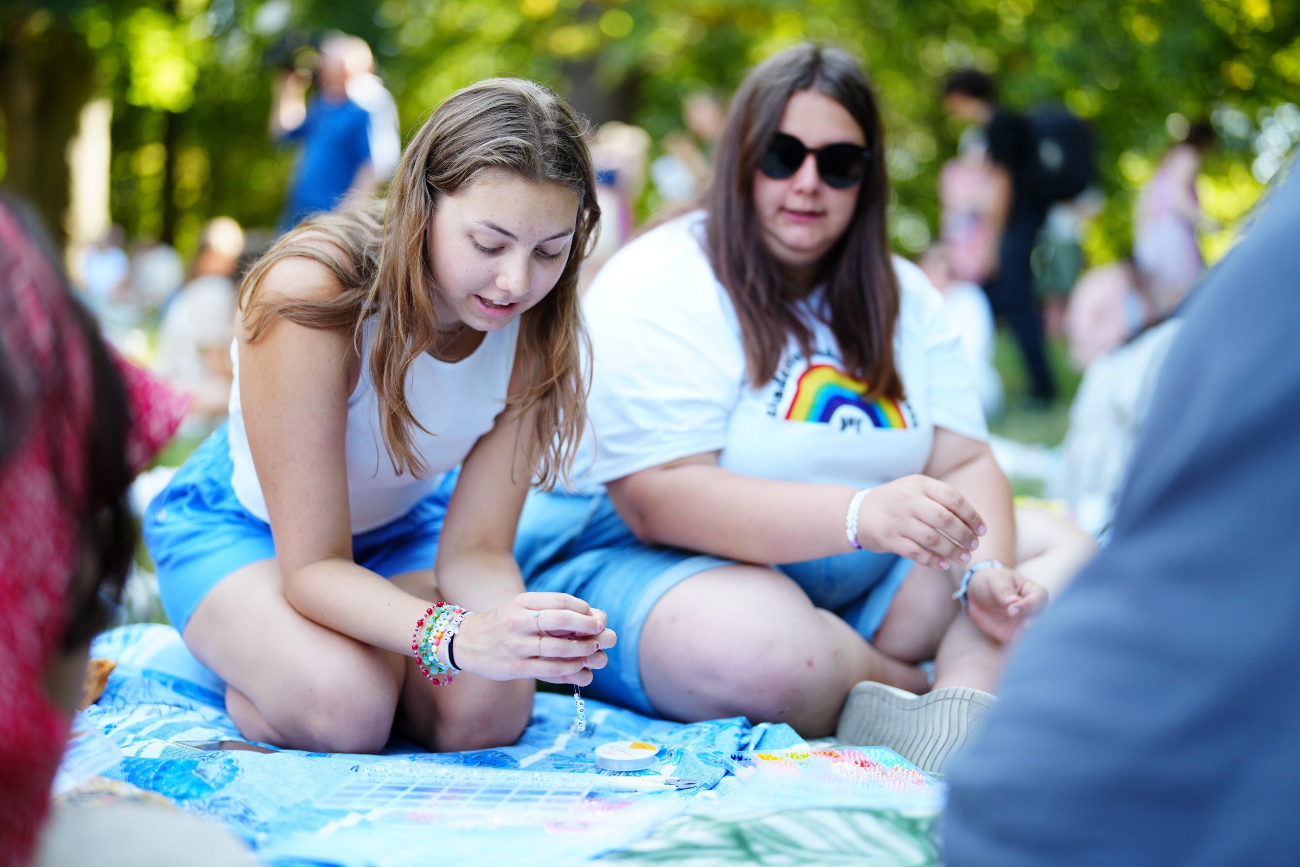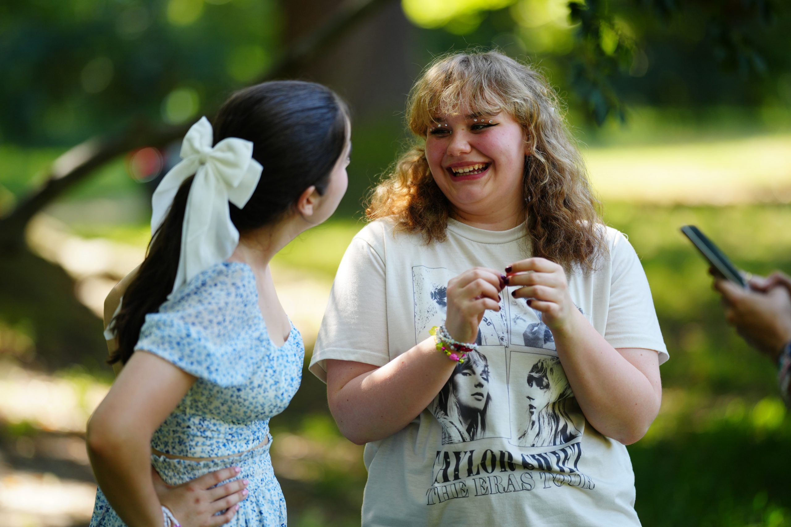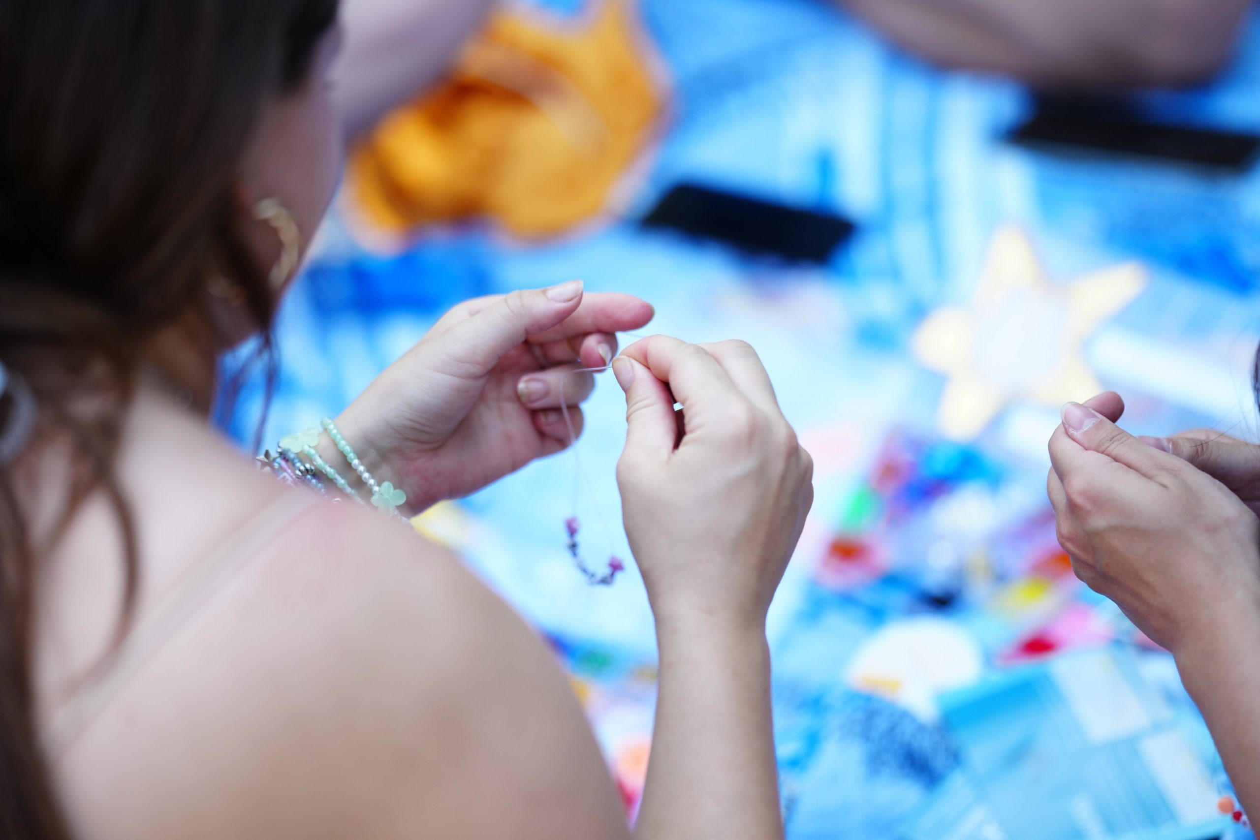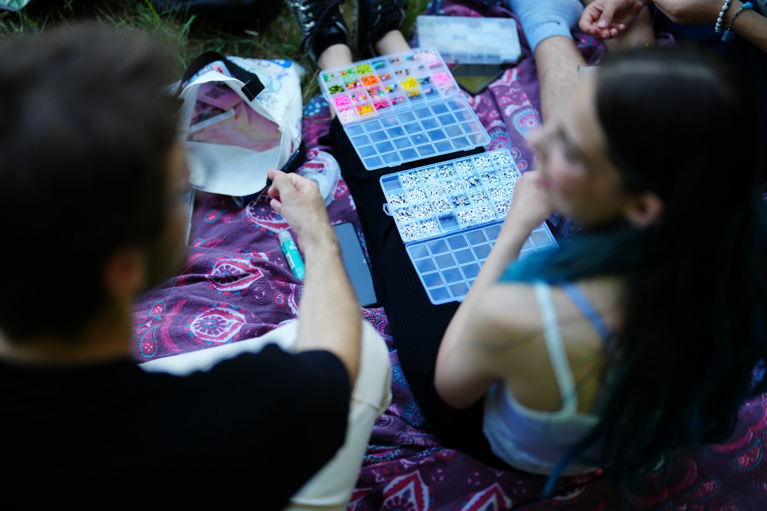 Einige der anwesenden Swifties basteln gemeinsam Armbänder. Ein ganzer Tisch steht im Schatten der Bäume, übersät mit Buchstabenperlen in kleinen Dosen. Dass weltweit Swift-Fans Armbänder knüpfen und austauschen, kommt von einer Songzeile aus dem Song "You're on your own, Kid". Darin heißt es "So make the friendship bracelets, take the moment and taste it." Tiffany, die aus Katar anreiste, erzählt stolz: "Mit meiner Mutter habe ich über 200 Stück im Vorfeld gemacht, um sie hier in Wien zu tauschen." Voller Begeisterung zeigt sie auch ihre selbstverzierte Jacke her, auf der überall Glitzersteinchen und Abbildungen ihres Idols sind.