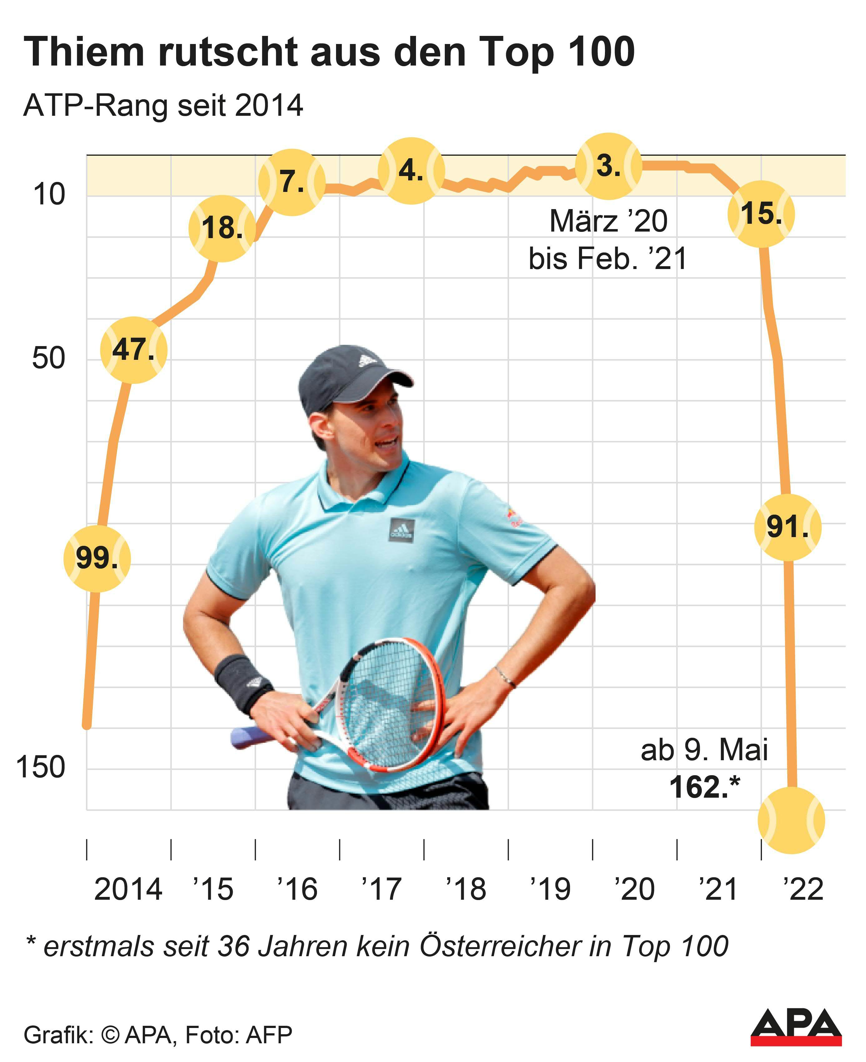 Thiems Absturz stand spätestens nach dem Erstrunden-Aus in Madrid gegen Andy Murray fest. Der am Montagabend in Rom spielende Niederösterreicher stellte sich danach bereits auf den Rückfall ein. "Es ist die logische Konsequenz, so wie die Rangliste funktioniert", sagte Thiem. Seit März 2014 - damals als 20-Jähriger - war er immer in den Top 100 dabei. Damals war noch Jürgen Melzer Österreichs Nummer eins. Dass kein Österreicher in den ersten Hundert dabei ist, hat es seit 28. April 1986 nicht mehr gegeben. Damals war Thomas Muster als 18-Jähriger auf Rang 119 klassiert, ehe sein Aufstieg begann.