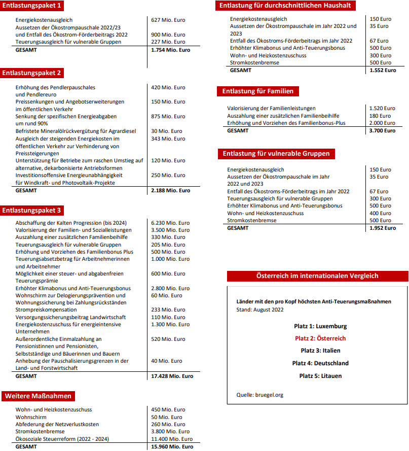 Dass das mehr als Selbstlob sei, versuchte der Bundeskanzler mit dem Verweis auf andere europäische Länder zu entkräften. Verteilt wurde ein Medienpapier, das Österreich bei insgesamt 37,7 Mrd. Euro die zweithöchsten Pro-Kopf-Antiteuerungsmaßnahmen hinter Luxemburg attestiert. In Österreich beträgt die Pro-Kopf-Entlastung demnach 4.147 Euro, in Deutschland 3.511 Euro.
