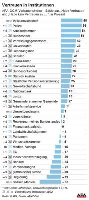 Der Vertrauensindex funktioniert so, dass (in diesem Fall bei 1.028 Personen) abgefragt wird, ob man einer Institution vertraut oder nicht. Der Saldo daraus ergibt bei der Volksanwaltschaft einen Wert von plus 58 und bei der Polizei von plus 56. Dahinter folgt im Vertrauensranking die Arbeiterkammer (54), die gegenüber dem Vorjahr ein Plus von vier Punkten verzeichnen konnte. Auf den Plätzen vier bis zehn folgen das Bundesheer (51), der Verfassungsgerichtshof (40), die Universitäten (39), der Rechnungshof (36), die Schulen (31), die Finanzämter und die Krankenkassen (beide 29). Der Bundespräsident (28) verlor gegenüber dem Vorjahr vier Punkte und rangiert nunmehr auf Platz 11.