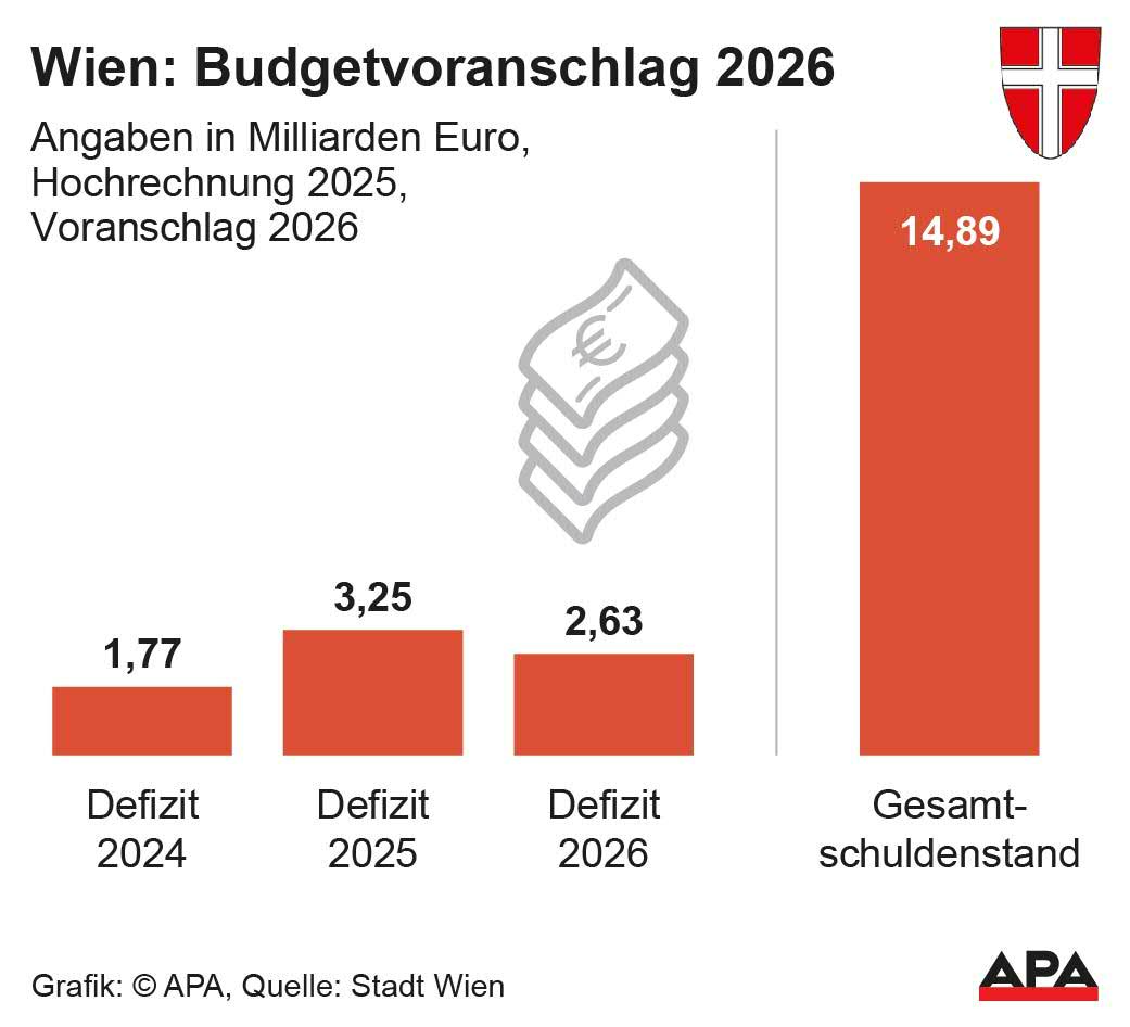 The estimate for the Vienna budget 2026 is available. As the office of Finance City Councillor Barbara Novak (SPÖ) informed the APA, the total debt level of the city is expected to rise to 14.89 billion euros according to the draft. The deficit will amount to 2.63 billion euros. Revenues of 19.51 billion euros are offset by expenditures of 22.14 billion euros. According to City Hall, the fact that Vienna is putting together a savings package and has already taken consolidation steps is already having an effect.