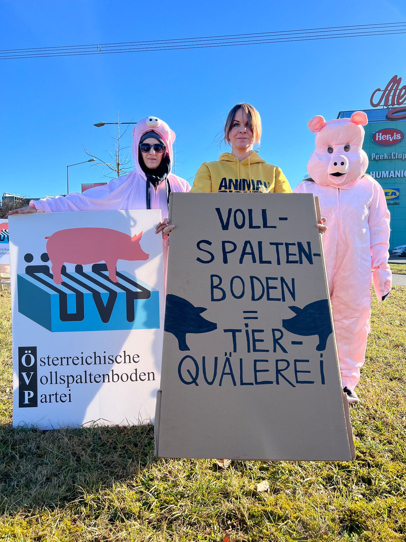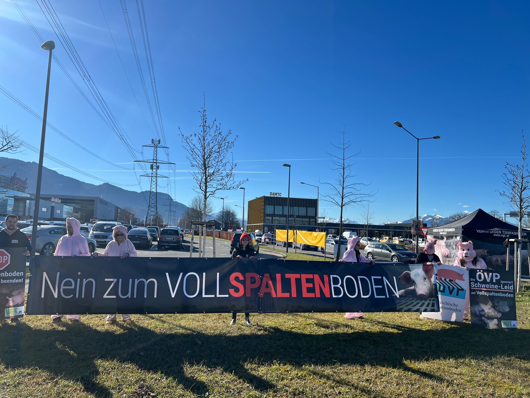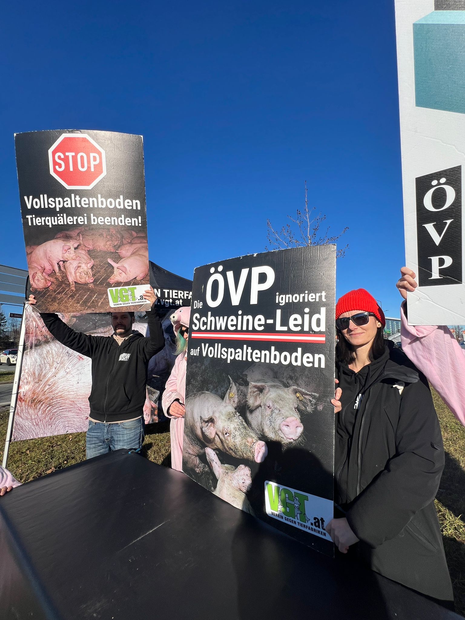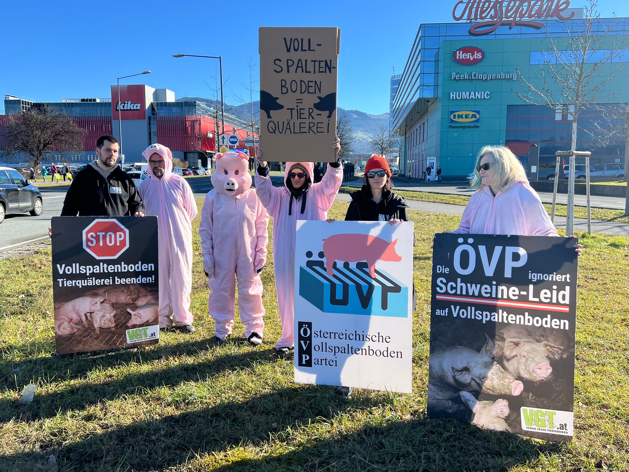 Am Samstag haben sich mehrere Mitglieder des "VGT" (Verein gegen Tierfabriken" bei der Messepark-Krezung versammelt und gegen die Politik der ÖVP zu protestieren.