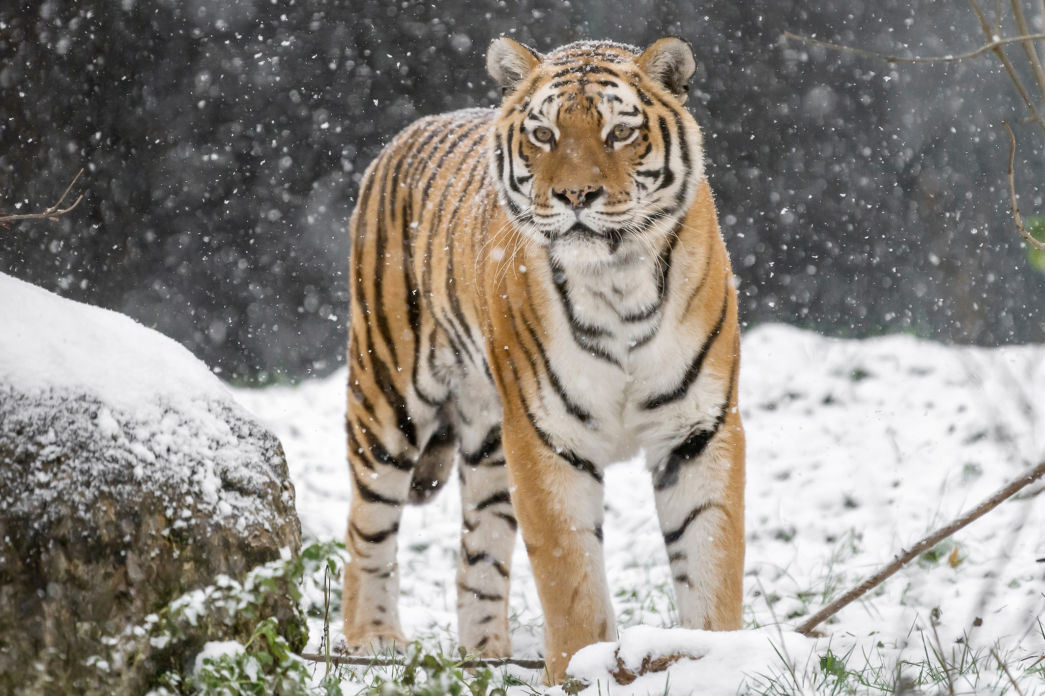 Die stark bedrohten Sibirischen Tiger lieben es, ausgelassen im Schnee herumzutollen. In ihrer Heimat in Russland und Nordchina liegt fast das ganze Jahr über Schnee, daher verfügen die Tiger über eine dicke Fettschicht, die sie auch bei frostigen Temperaturen warmhält. Das Fell auf der Unterseite ihrer Pfoten verhindert, dass sie im Schnee und auf Eis ausrutschen.