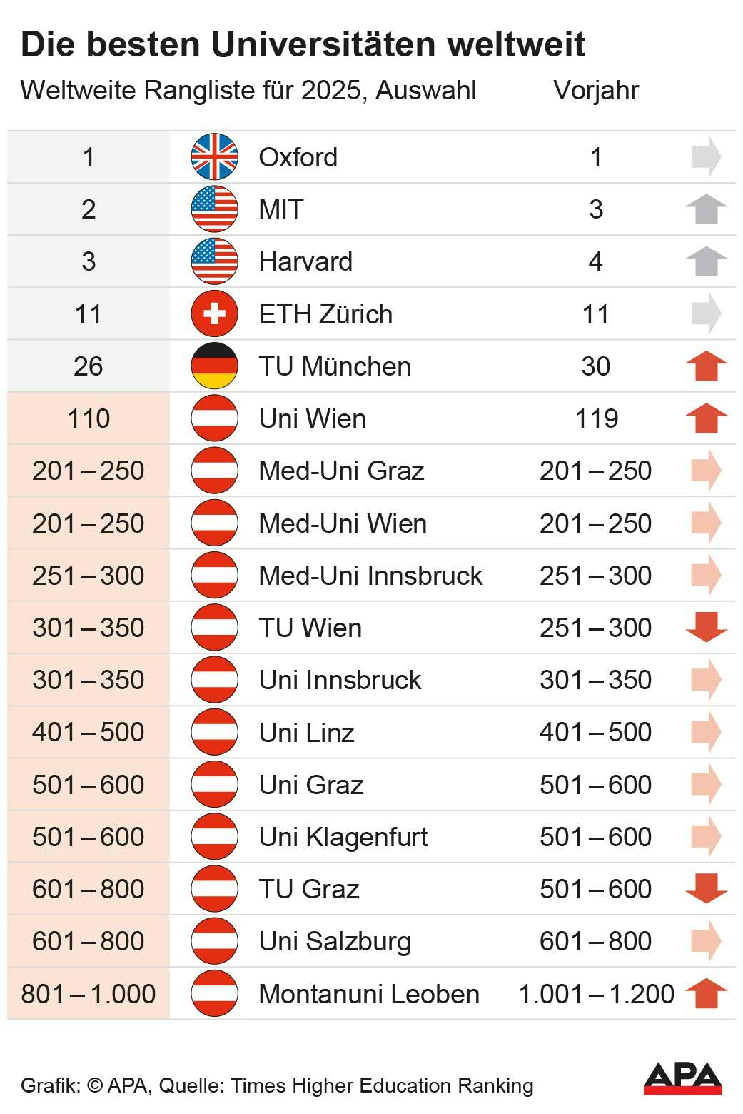 Keine Änderungen gab es dann für die drei nächstklassierten heimischen Unis: Die Universität Linz blieb auf den Plätzen 401-500, die Unis Klagenfurt und Graz jeweils auf 501-600. Dahinter verlor die TU Graz Plätze und landete auf den Rängen 601-800 (Vorjahr: 501-600), dort findet sich auch unverändert die Uni Salzburg. Die Montanuni Leoben schaffte heuer den Eintritt in die Top 1.000 (Plätze 801-1.000).