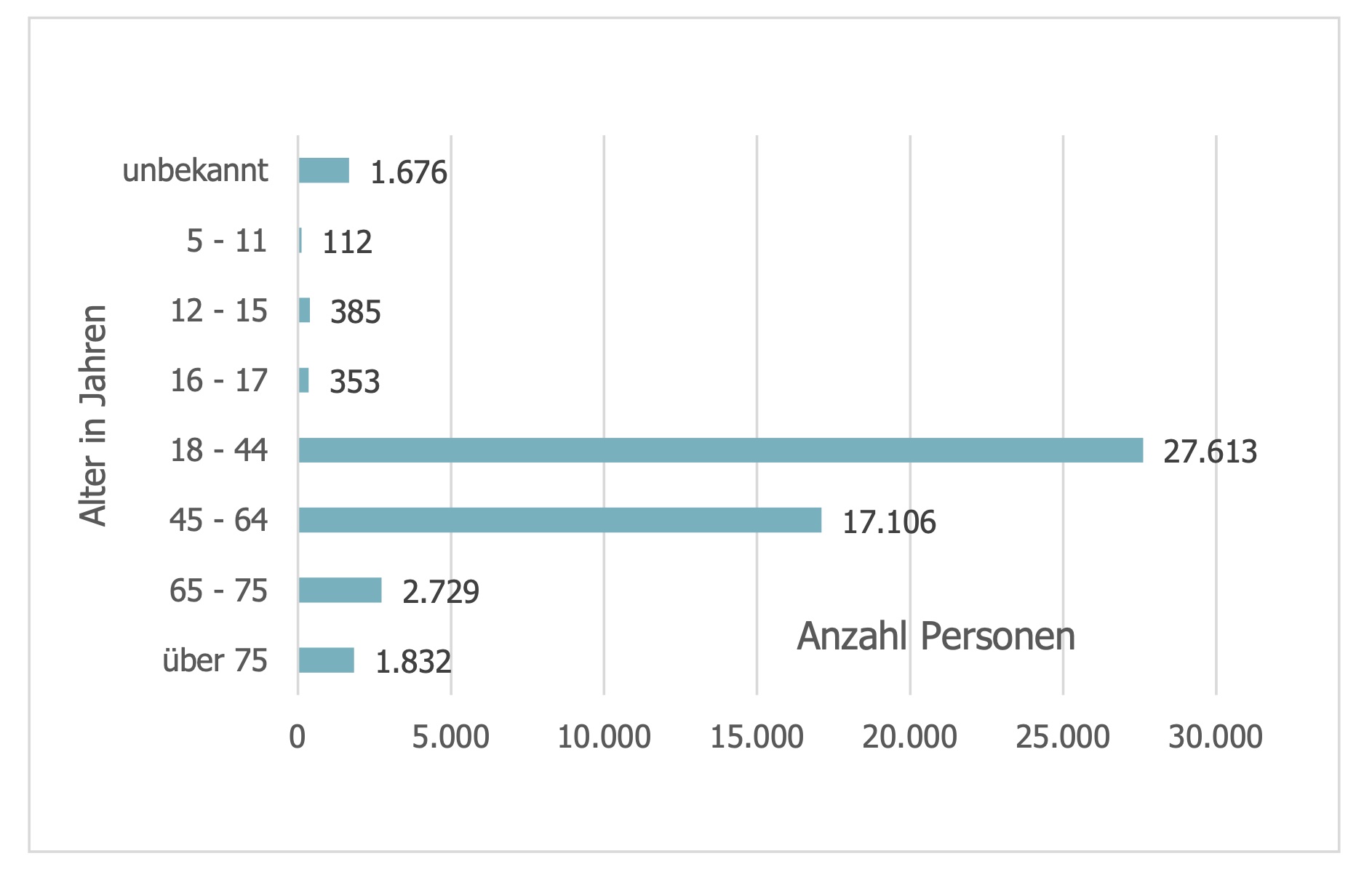 Die Mehrheit der vermuteten Nebenwirkungen trat bei Menschen im Alter von 18-44 Jahren auf (27.613 Personen), gefolgt von denen im Alter von 45-64 Jahren (17.106 Personen). Davon waren 66 Prozent weiblich und 33 Prozent männlich, bei den restlichen Meldungen wurde das Geschlecht nicht erfasst, bzw. als divers angegeben.W