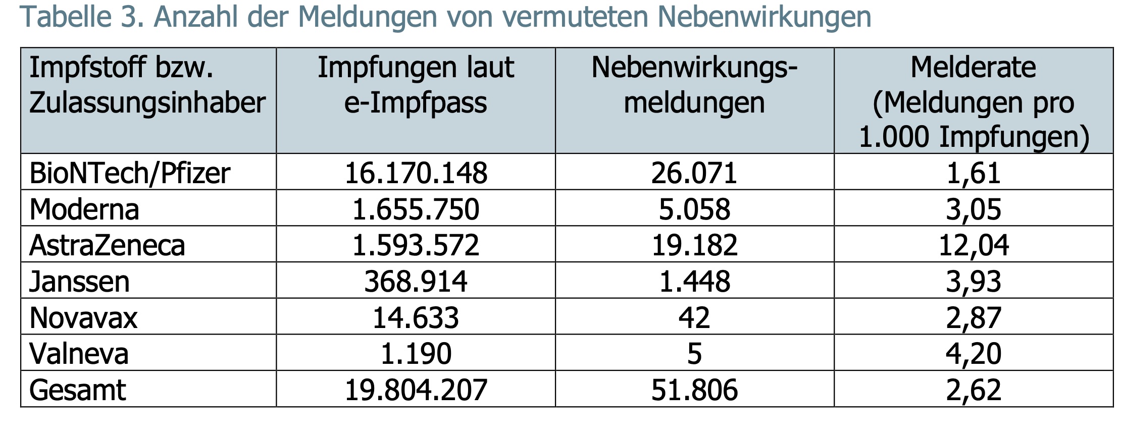 - 421 Fälle einer Herzmuskelentzündung wurden berichtet. Hiervon verstarben acht Patienten, wobei lediglich bei einem Patienten der Zusammenhang mit der Impfung nicht geklärt ist, bei den anderen sieben Personen wird ein Zusammenhang ausgeschlossen.