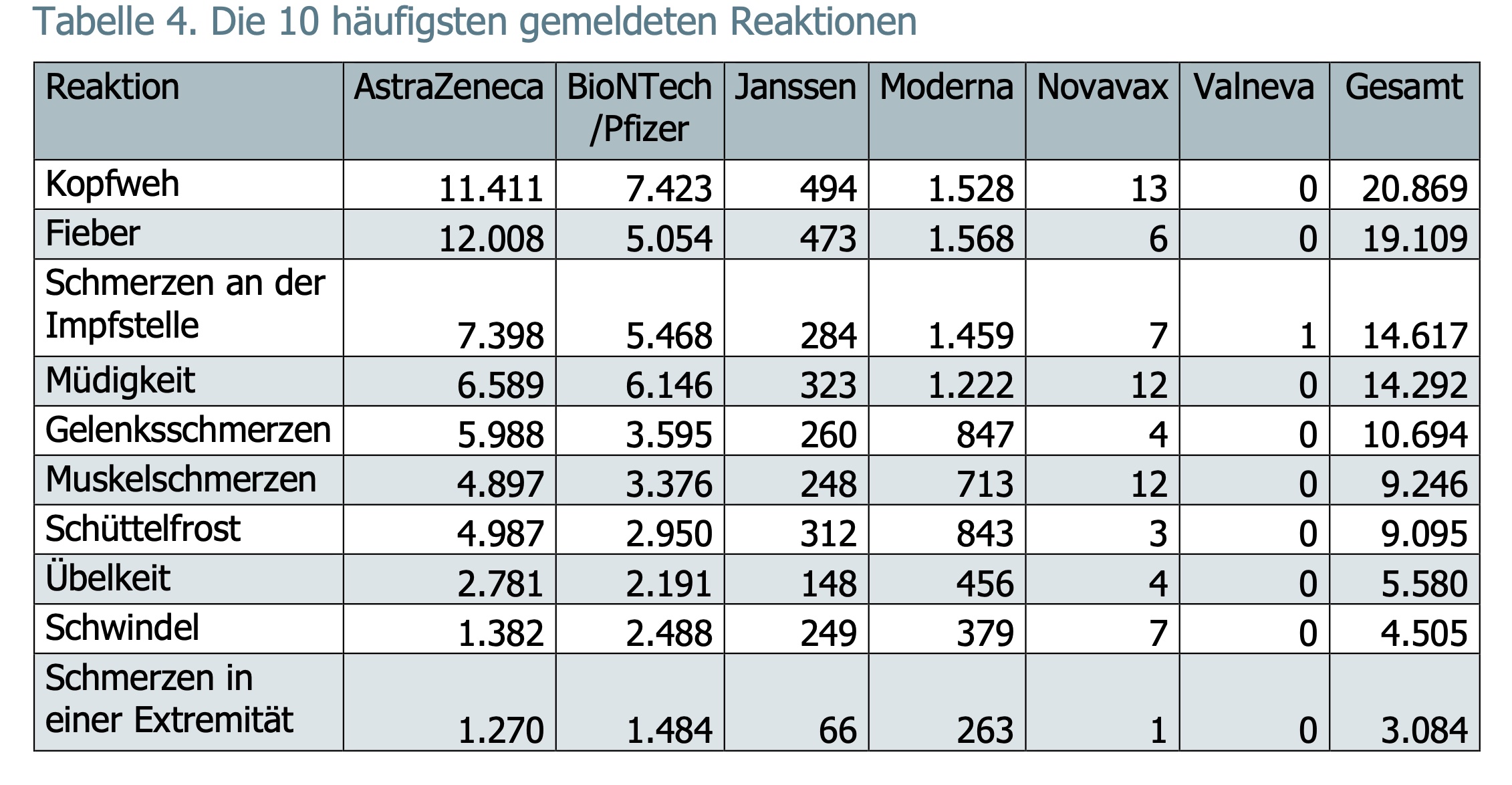 Bei den am häufigsten gemeldeten Nebenwirkungen/Impfreaktionen ergibt sich folgendes Bild: