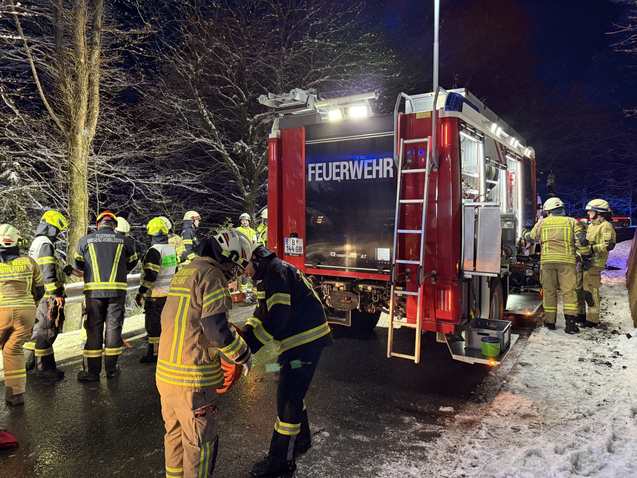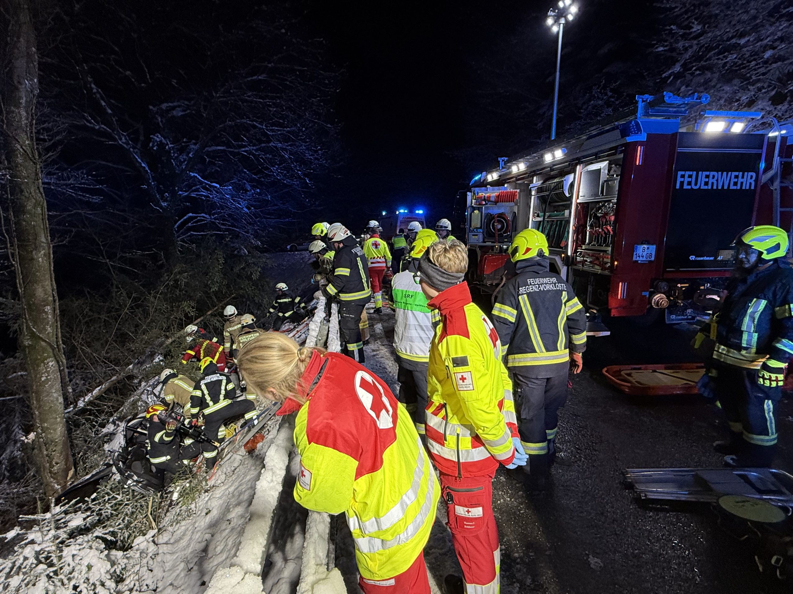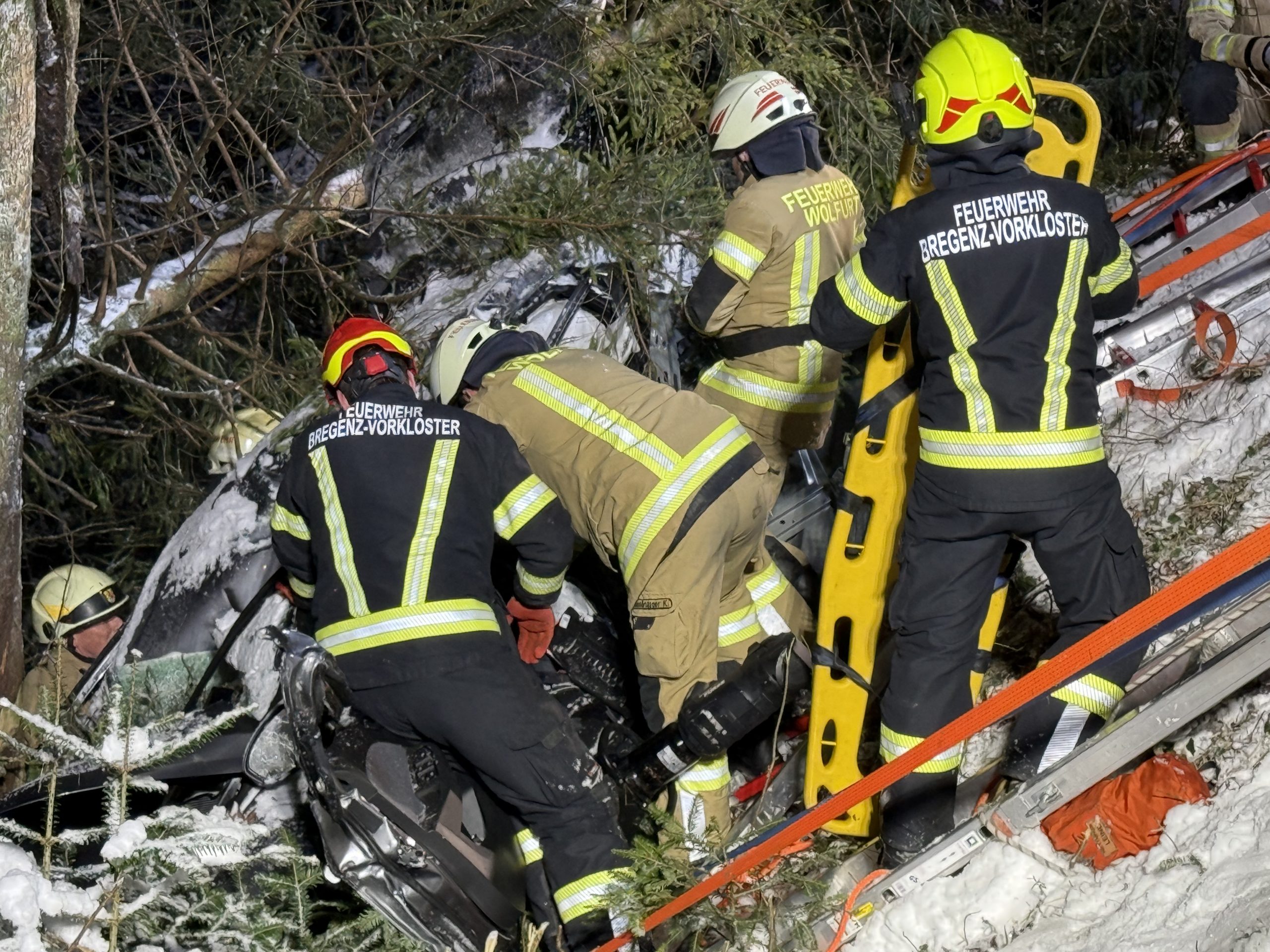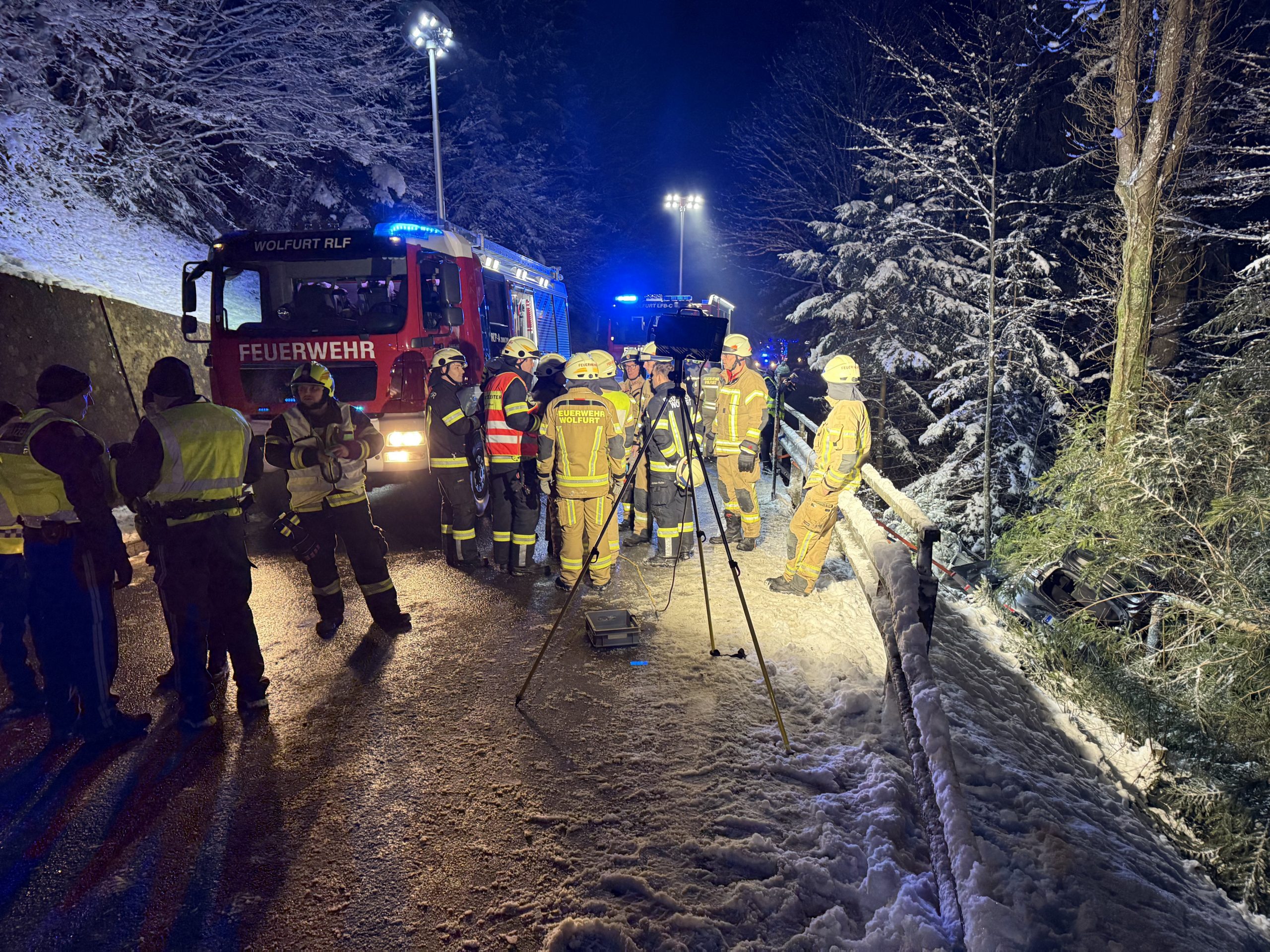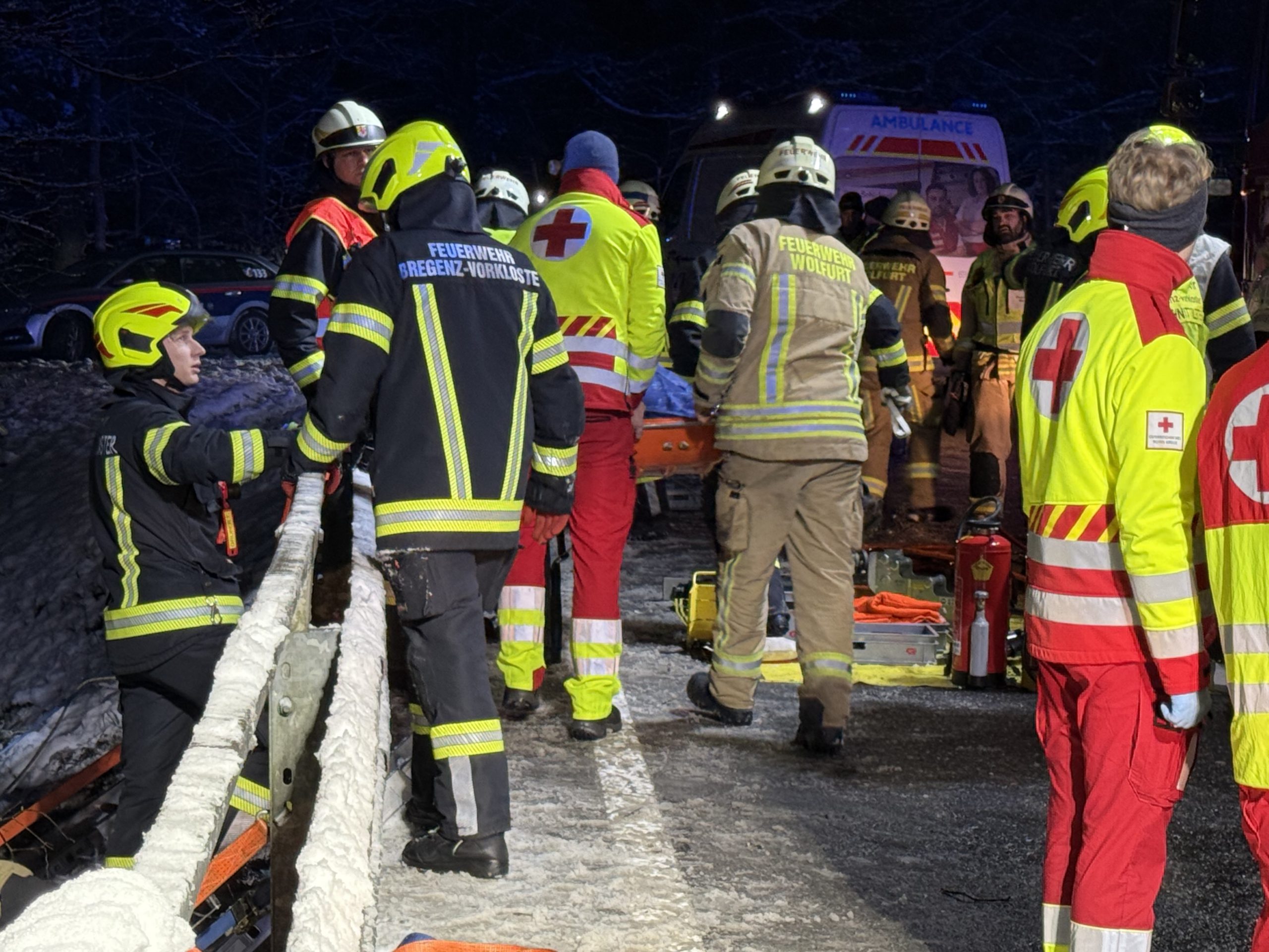 Durch das automatische Notrufsystem (eCall) des Unfallwagens wurde die Polizei alarmiert. Aufgrund des unwegsamen Geländes war eine aufwendige Bergung nötig: Die Feuerwehr Wolfurt befreite den Fahrer aus dem Wrack und transportierte ihn mithilfe einer Trage zurück auf die Bucher Straße.
