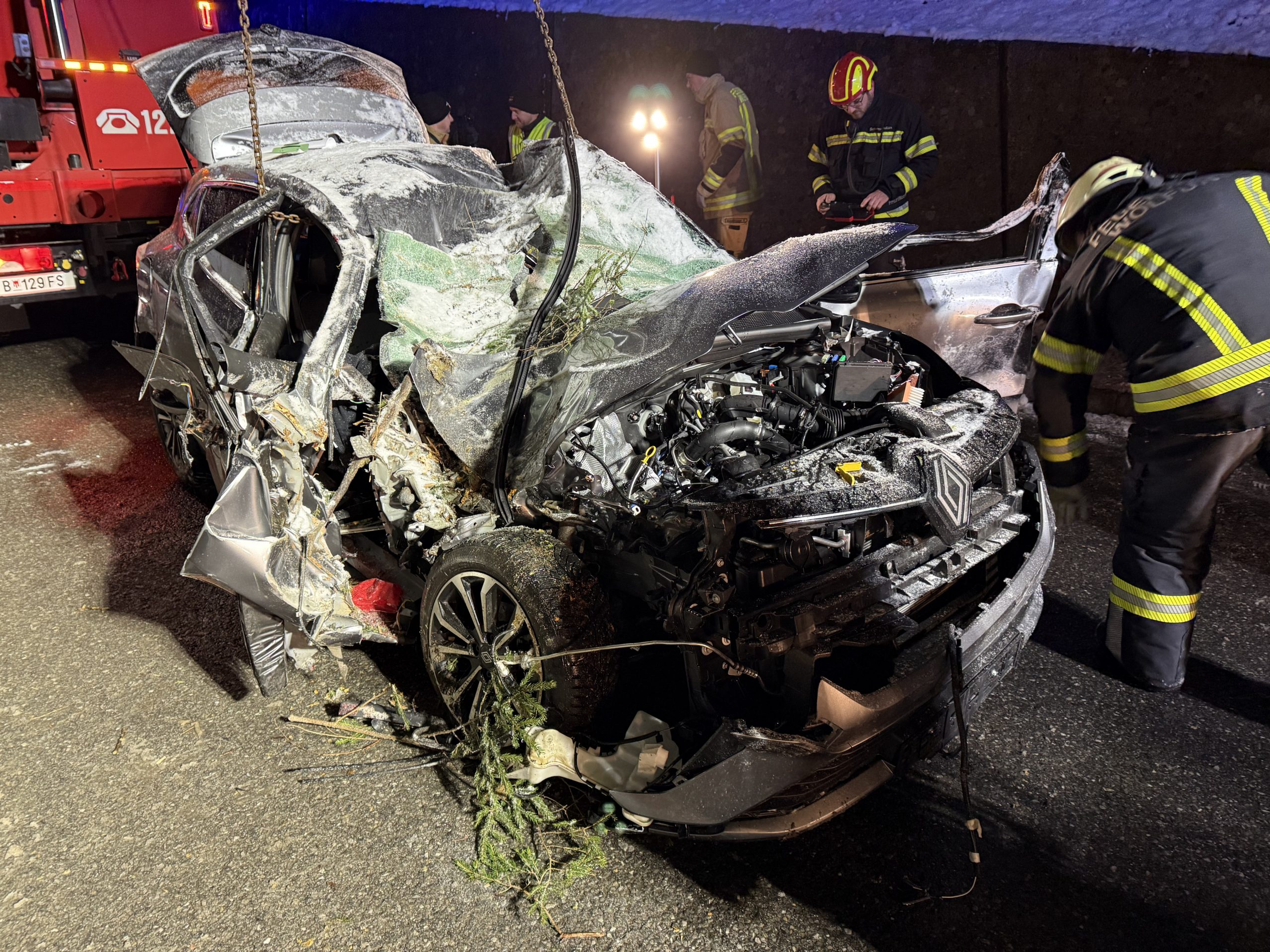 Dabei passierte das Fahrzeug knapp die Leitschiene, geriet auf eine schneebedeckte Fläche und fuhr auf eine Kuppe zu. In der Folge stürzte der Wagen in ein steil abfallendes Tobel. Nach rund 13 Metern prallte das Fahrzeug mit voller Wucht gegen einen Baum.