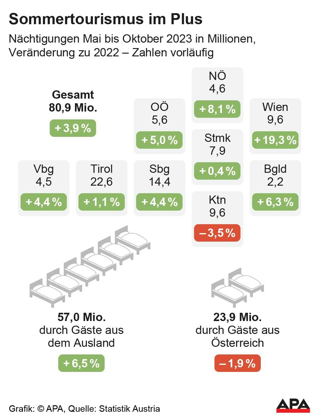 Zwischen Mai und Oktober seien 80,9 Millionen Nächtigungen in Österreich verzeichnet worden und damit so viel wie in keinem anderen Sommer seit Beginn der statistischen Aufzeichnungen, gab die Statistik Austria am Dienstag bekannt. Dazu beigetragen haben ausländische Gäste, deren Nächtigungen um 6,5 Prozent auf 57,04 Millionen zulegten. Ein starkes Plus gab es in Wien, Kärnten war hingegen im Minus.