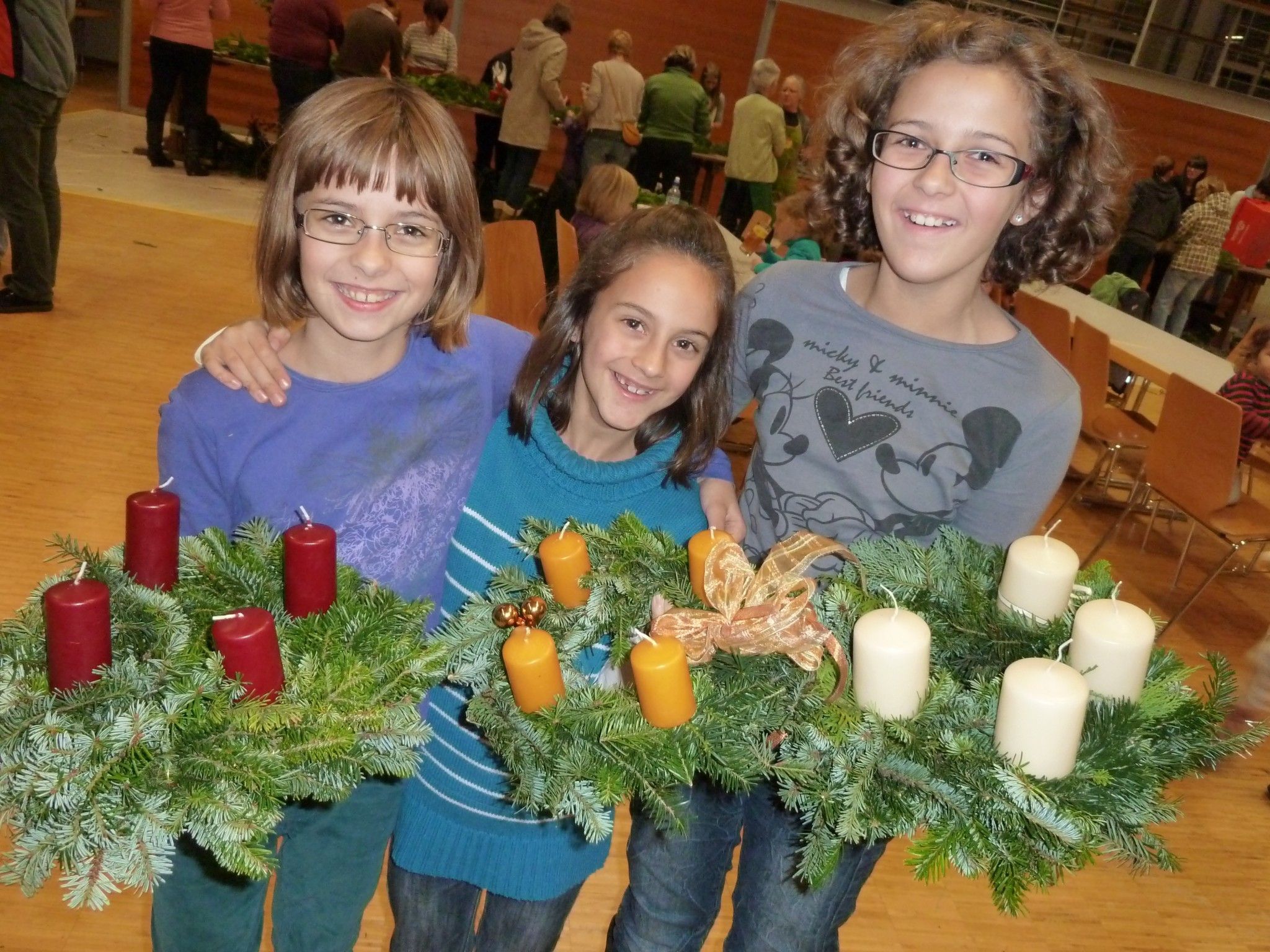Auch diesmal waren 20 ehrenamtliche Helfer den fleißigen Kranzern behilflich: Große, kleine runde oder längliche, schlichte oder moderne – es entstanden hunderte an individuellen Adventskränzen, welche von Kindern bis zu Pensionisten gebunden wurden, wobei darunter viele junge Mütter anzutreffen waren. Das Binden der Kränze war kostenlos, da die Agrargemeinschaft Rankweil Reisig zur Verfügung gestellt hatte. Natürlich kam auch die Gemütlichkeit nicht zu kurz, denn die Ministranten sorgten für Speis und Trank.