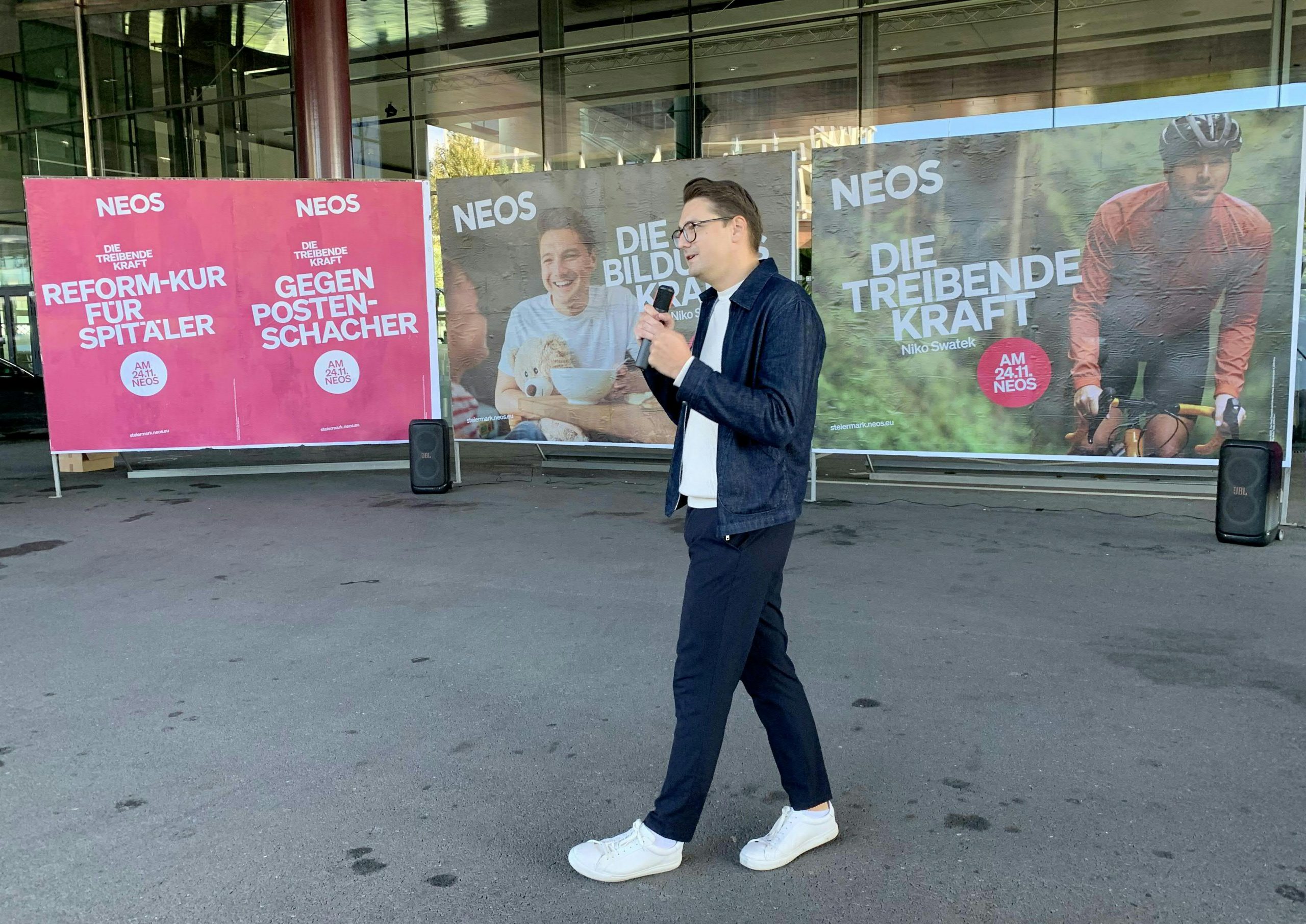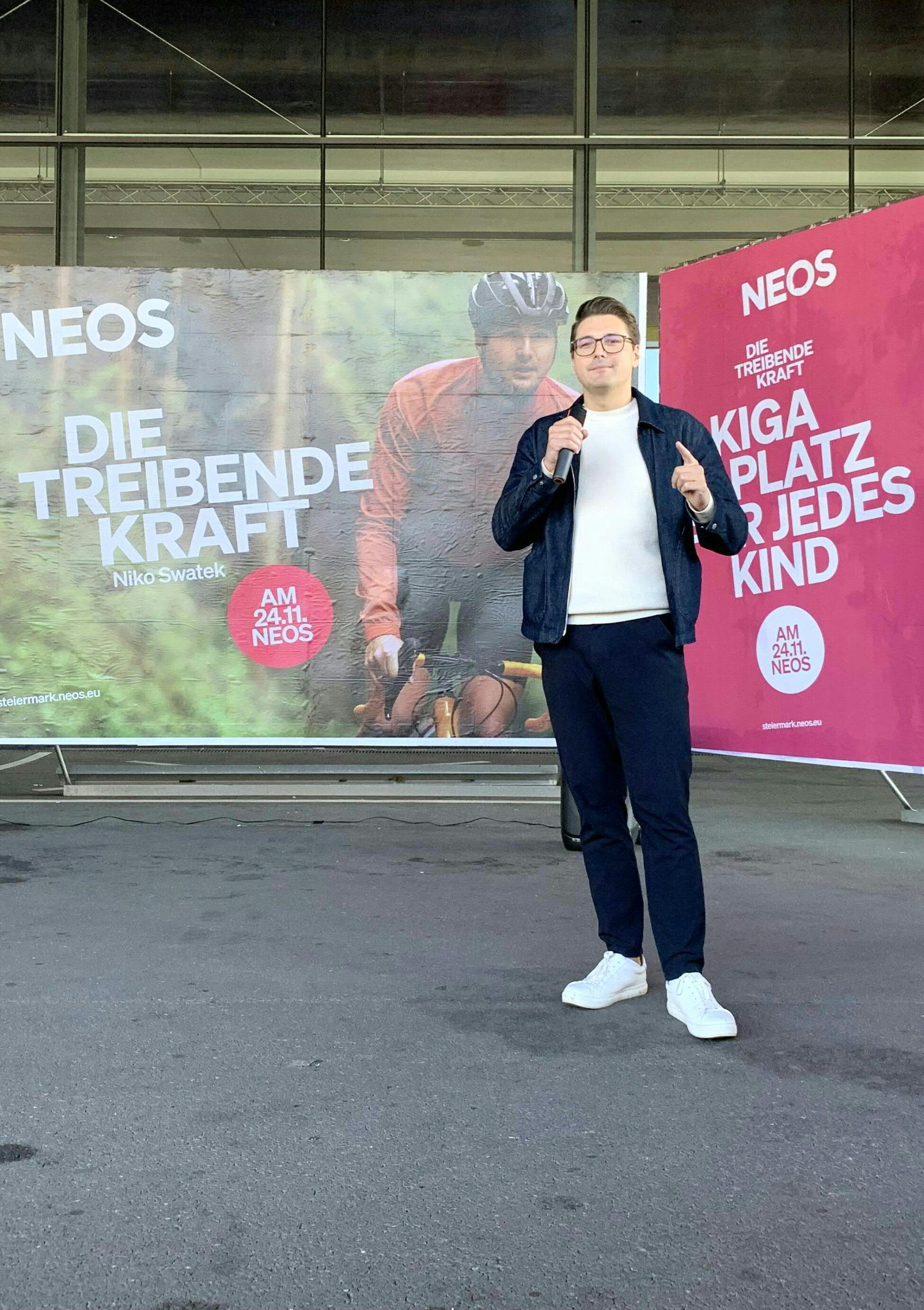 Swatek meinte, er habe sich auf den Sujets so zeigen wollen, wie er auch im Alltag sei: "Berufsoptimist, Familienvater und Techniker". "Wir haben uns entschieden, bei der Kampagne nicht dick aufzutragen", sagte er weiter. Er sprach Themen wie wirtschaftliche Rezession, mangelnde Lesefähigkeiten bei Kindern und die Teuerung an. Es brauche NEOS als "treibende Kraft" für Veränderungen, meinte er in Anspielung auf die Kampagne. "Unsere besten Jahre liegen noch vor uns", ist er überzeugt. Sowohl bei der EU- als auch bei der Nationalratswahl zählten die NEOS zu den Gewinnern.