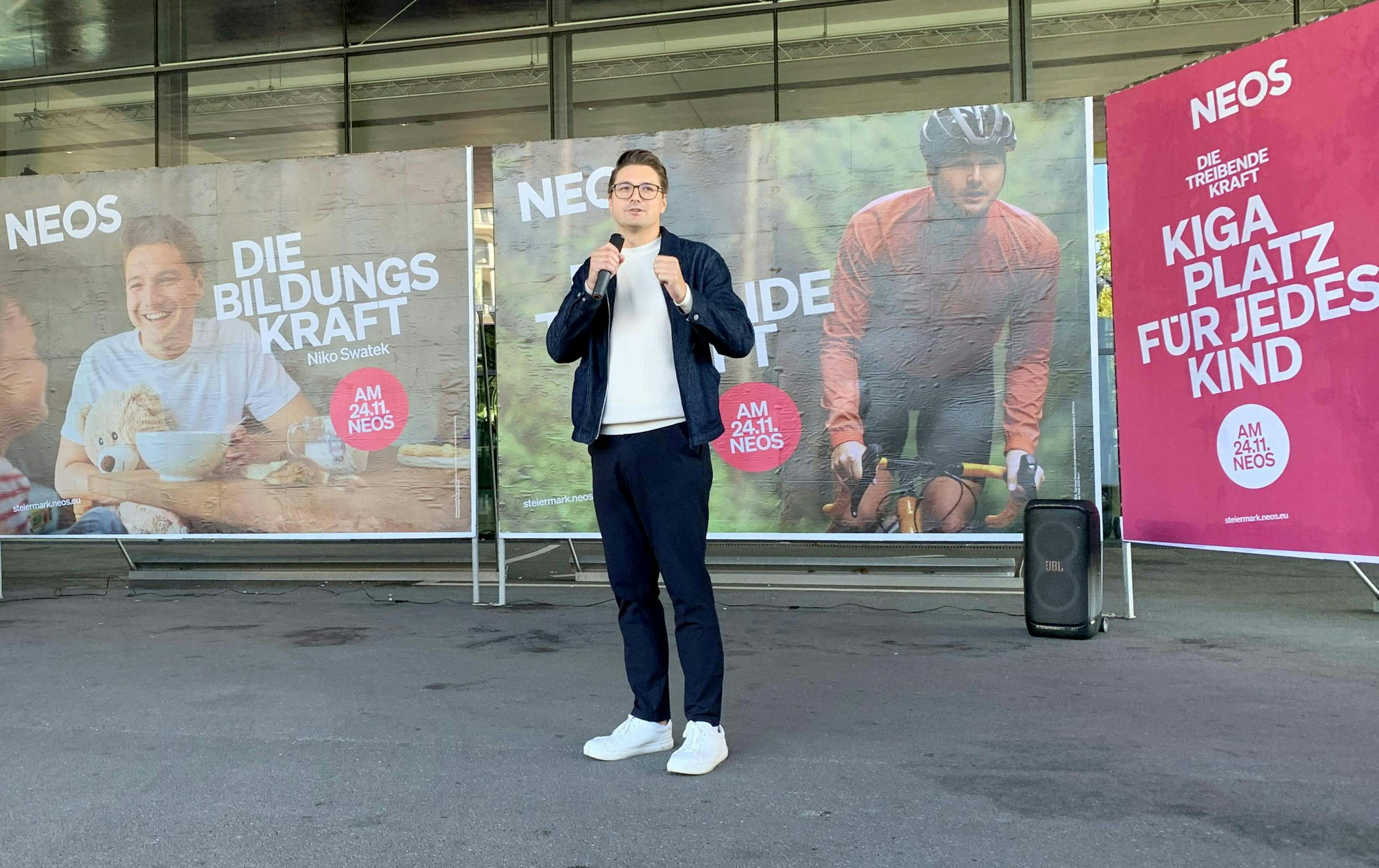 "Heute geht's los", läutete Swatek die Pressekonferenz vor der Grazer Stadthalle ein. Die Steiermark werde in den kommenden Monaten "pink erstrahlen" - sowohl durch die Plakate als auch durch die Aktivistinnen und Aktivisten, die in den kommenden Wochen zusammen mit den Politikerinnen und Politikern durch die Steiermark touren werden. Die NEOS-Abgeordneten im neuen Nationalrat, Veit Dengler und Fiona Fiedler, werden den Wahlkampf ebenfalls unterstützen, sagte Landesgeschäftsführer Christian Pichler.