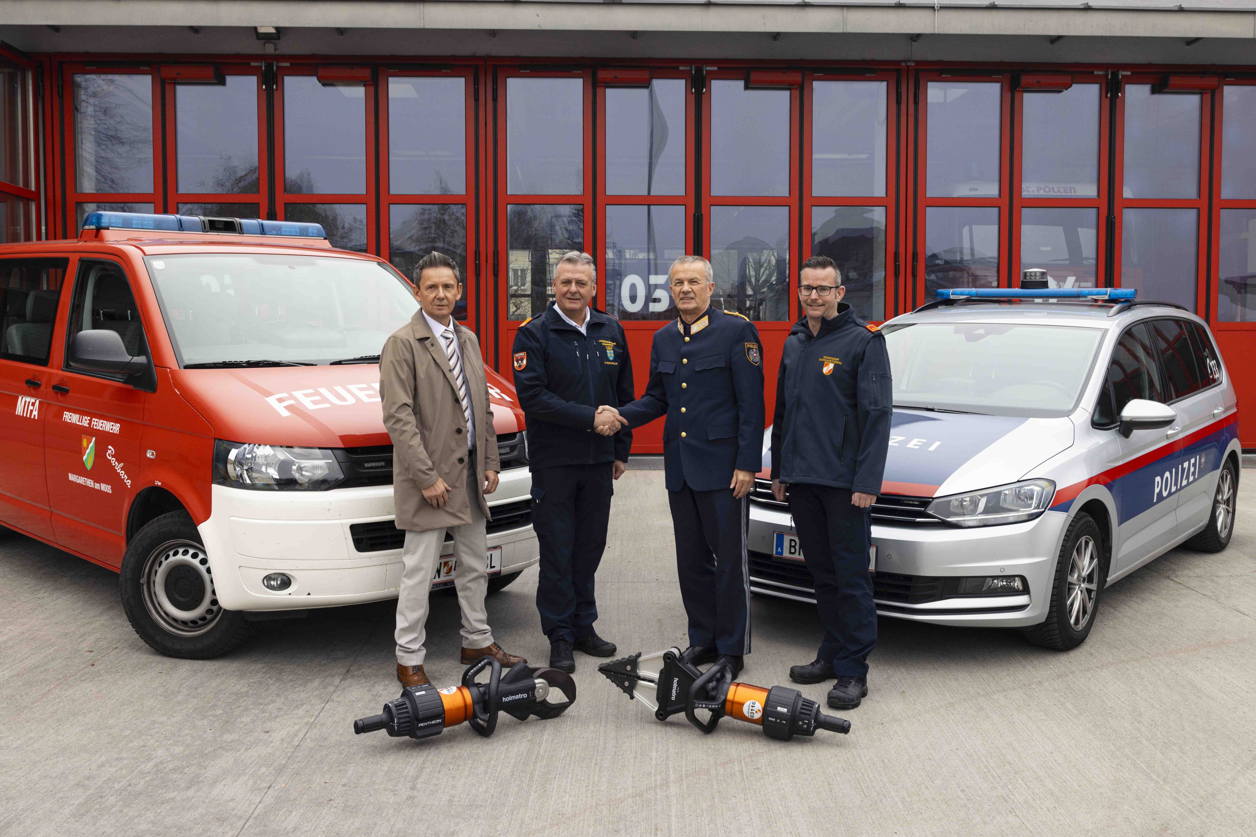Verantwortlich sein sollen die Beschuldigten für einen Gesamtschaden von rund 463.000 Euro. Neben drei versuchten Bankomat-Einbrüchen in Niederösterreich und einem in Wien wurde dem Trio auch je ein Einbruchsdiebstahl in ein Kosmetikstudio in der Bundeshauptstadt sowie in das Feuerwehrhaus in Margarethen am Moos in der Marktgemeinde Enzersdorf an der Fischa (Bezirk Bruck an der Leitha) zugeordnet, wo ein Akku-Rettungsset im Wert von rund 40.000 gestohlen wurde. Die Rückgabe der sichergestellten hydraulischen Geräte an die Freiwillige Feuerwehr erfolgte am (gestrigen) Mittwoch von Landespolizeidirektor Franz Popp und Stefan Pfandler, dem Leiter des Landeskriminalamts Niederösterreich. "Wir sind sehr froh, dass die gestohlenen Geräte für ihre wesentliche Verwendung, nämlich zur Menschenrettung, wieder in unserem Besitz sind und zweckmäßig verwendet werden können," hob Landesfeuerwehrkommandant Dietmar Fahrafellner hervor.
