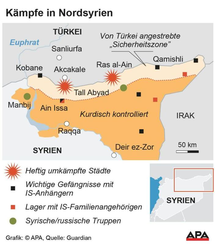 "Wir haben all unsere Aktivitäten gegen den IS eingefroren", sagte Maslum Abdi, Chef des Rebellenbündnisses SDF, in dem sich kurdische Kämpfer mit arabischen Milizen zusammengeschlossen haben, am Mittwoch dem kurdischen Fernsehsender Ronahi. Die Türkei hatte trotz internationaler Warnungen vor einer Woche ihre Offensive gestartet.