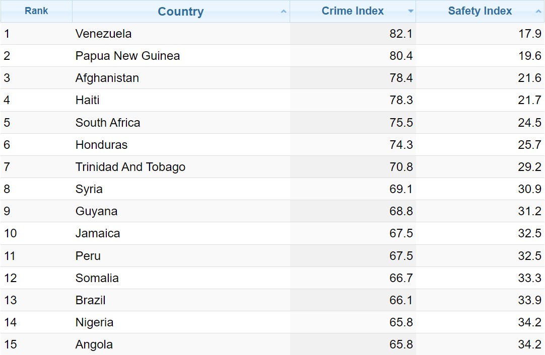 Im globalen Kontext führt Venezuela die Liste der unsichersten Länder an, gefolgt von Papua-Neuguinea, Afghanistan, Haiti und Südafrika. Das sicherste Land weltweit ist nach Numbeos Erhebung Katar.