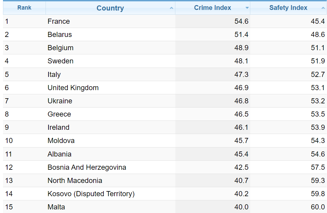 Laut der neuesten Untersuchung der Research-Firma Numbeo steht Frankreich an der Spitze der Liste der gefährlichsten Länder Europas. In der Bewertung, die sowohl objektive Kriminalitätsdaten als auch subjektive Sicherheitswahrnehmungen berücksichtigt, folgen Belarus, Belgien, Schweden und Italien.