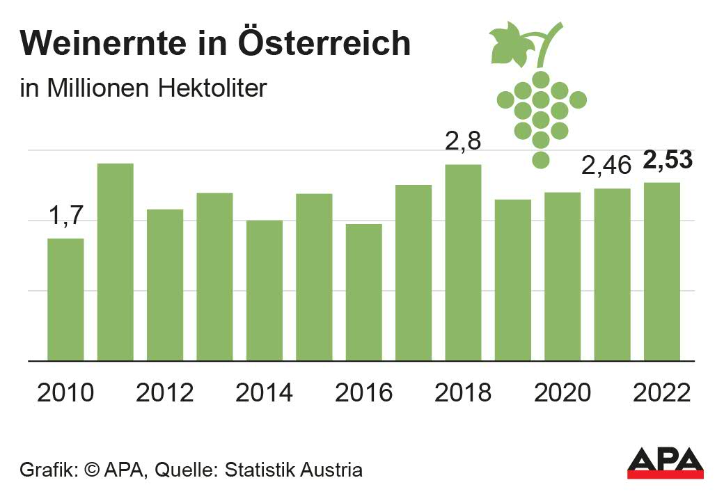 Im bedeutendsten Weinbaubundesland Niederösterreich wurde mit 1,61 Mio. hl im Fünfjahresvergleich zwar eine überdurchschnittliche Ernte (plus drei Prozent) verzeichnet, die Erntemenge lag jedoch um ein Prozent unter der Vorjahresproduktion. Auf Weißwein entfielen 1,26 Mio. hl (minus zwei Prozent zu 2021), während Rotwein mit 347.700 hl ein Plus von zwei Prozent verzeichnete.