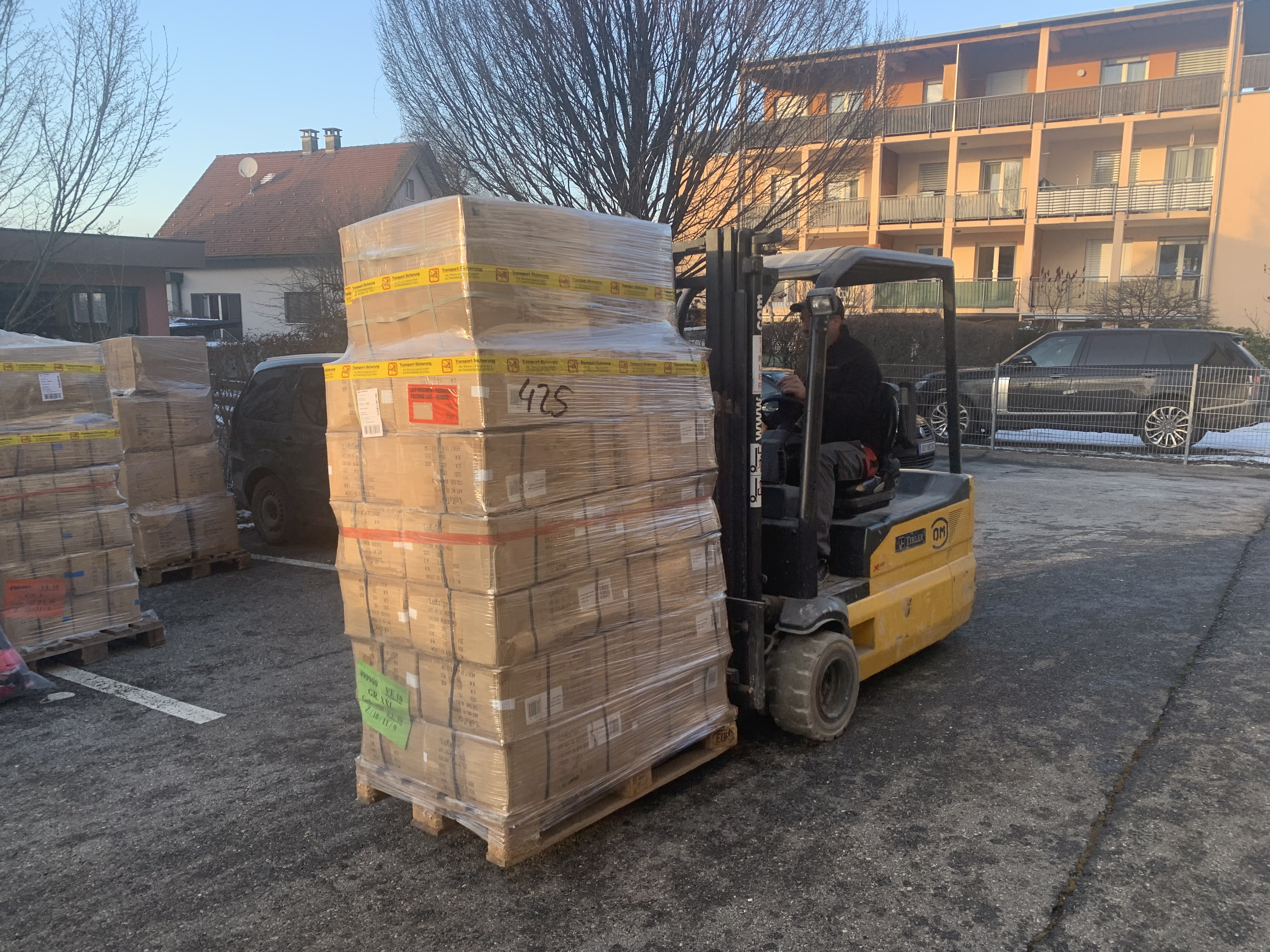 "Wir haben von den Firmen Haberkorn und Pfanner etwa 18 Paletten neue Schutzkleidung bekommen. Wirklich sehr wertvolle Sachen. Dazu kommen noch 40 Säcke an Kleidung von der Caritas. Wir haben Geld gesammelt für Strom Generatoren, davon haben wir zwei Paletten. Auch Privatpersonen haben Kleidung, Ausrüstung wie Schlafsäcke, Gaskocher und anderes gespendet. Insgesamt haben wir 26 Paletten und rund eineinhalb Tonnen Gebrauchtkleidung die wir heute in den LKW verladen", zeigt sich die gebürtige Ukrainerin begeistert. "Der Transport hat einen Gesamtwert von rund 300.000 Euro und ist damit eine der größten und wertvollsten privat organisierten Lieferungen aus Westösterreich".