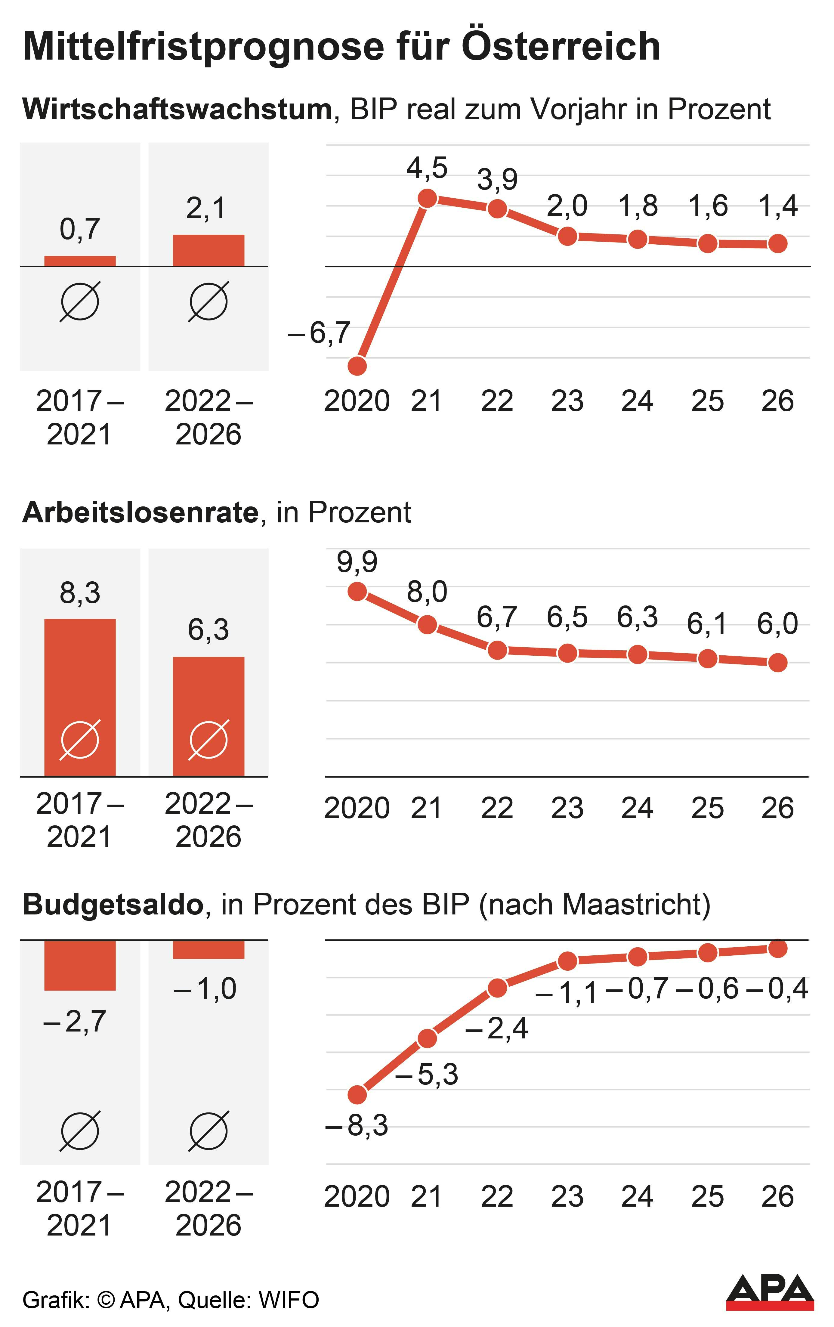 Der Privatkonsum dürfte im gesamten Prognosezeitraum von den 2020/21 während der Lockdowns angesammelten Ersparnissen profitieren und daher im Jahresschnitt um 2,3 Prozent zulegen können, beginnend mit +3,9 Prozent heuer. Für die Exporte sieht man pro Jahr 3,8 Prozent Zuwachs, für die Importe 3,7 Prozent, dabei heuer +6,1 bzw. +4,6 Prozent. Die Investitionen werden dieses Jahr noch durch die Investitionsprämie gestützt; bis 2024 wird eine Abschwächung erwartet, danach ab 2025 durch KÖSt-Senkung und Öko-Investfreibetrag ab 2025 wieder eine Zunahme.