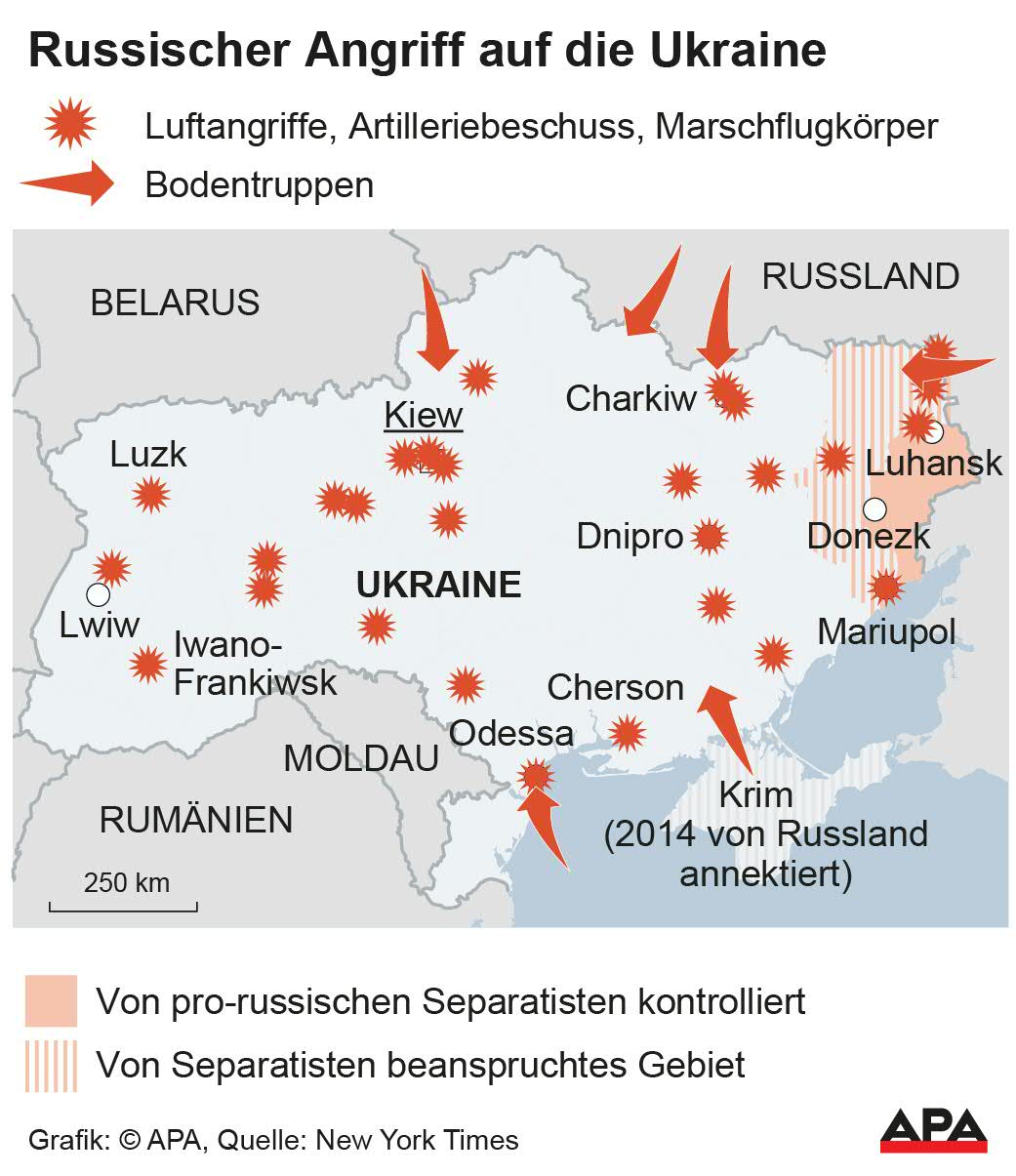 Teile der Provinz Cherson im Süden der Ukraine sind unterdessen nicht mehr unter Kontrolle der Regierungstruppen, wie die örtlichen Behörden mitteilen. Cherson liegt direkt nördlich von der von Russland 2014 annektierten Halbinsel Krim.