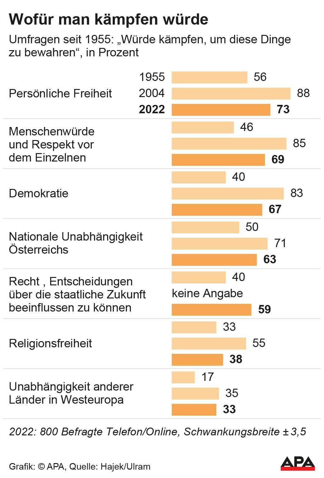 Die persönliche Freiheit, die Menschenwürde, die Demokratie und die nationale Unabhängigkeit Österreichs - das sind jene Werte, für die eine Mehrheit der Österreicher kämpfen würde, um sie zu bewahren. Das geht aus einer der APA vorliegenden Studie der Meinungsforscher und Politikwissenschafter Peter Ulram und Peter Hajek hervor. Im Vergleich zu früheren Umfragen sind diese Werte gegenüber 2004 zwar gesunken, aber immer noch höher als 1955.
