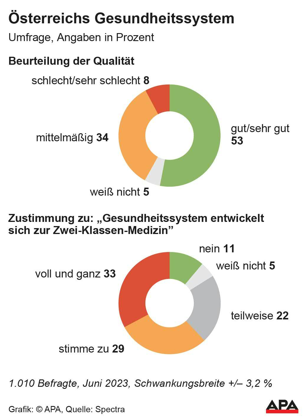 18 Prozent nannten als größtes Problem den Ärztemangel, 16 Prozent die langen Wartezeiten auf Ordinations- und Ambulanztermine. 13 Prozent hätten gerne mehr Kassenärzte und weniger Wahlärzte, ebenso viele wünschen sich, dass die Kasse mehr Therapieleistungen übernimmt. 62 Prozent der Österreicher - unter den chronisch Kranken sogar 74 Prozent - glauben, dass es sich immer mehr in Richtung Zwei-Klassen-Medizin entwickelt, weitere 22 Prozent stimmen dieser Behauptung zumindest teilweise zu. Wenig bis gar nicht anschließen können sich dieser Prognose nur elf Prozent.