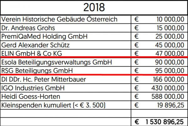 Die Bundes-ÖVP hatte am Dienstag die Spenderlisten für die Jahre 2018 und 2019 offengelegt. Dort sind zwei Firmen verzeichnet, die der Firma Rauch gehören und 185.000 Euro im Jahr 2018 gespendet haben.