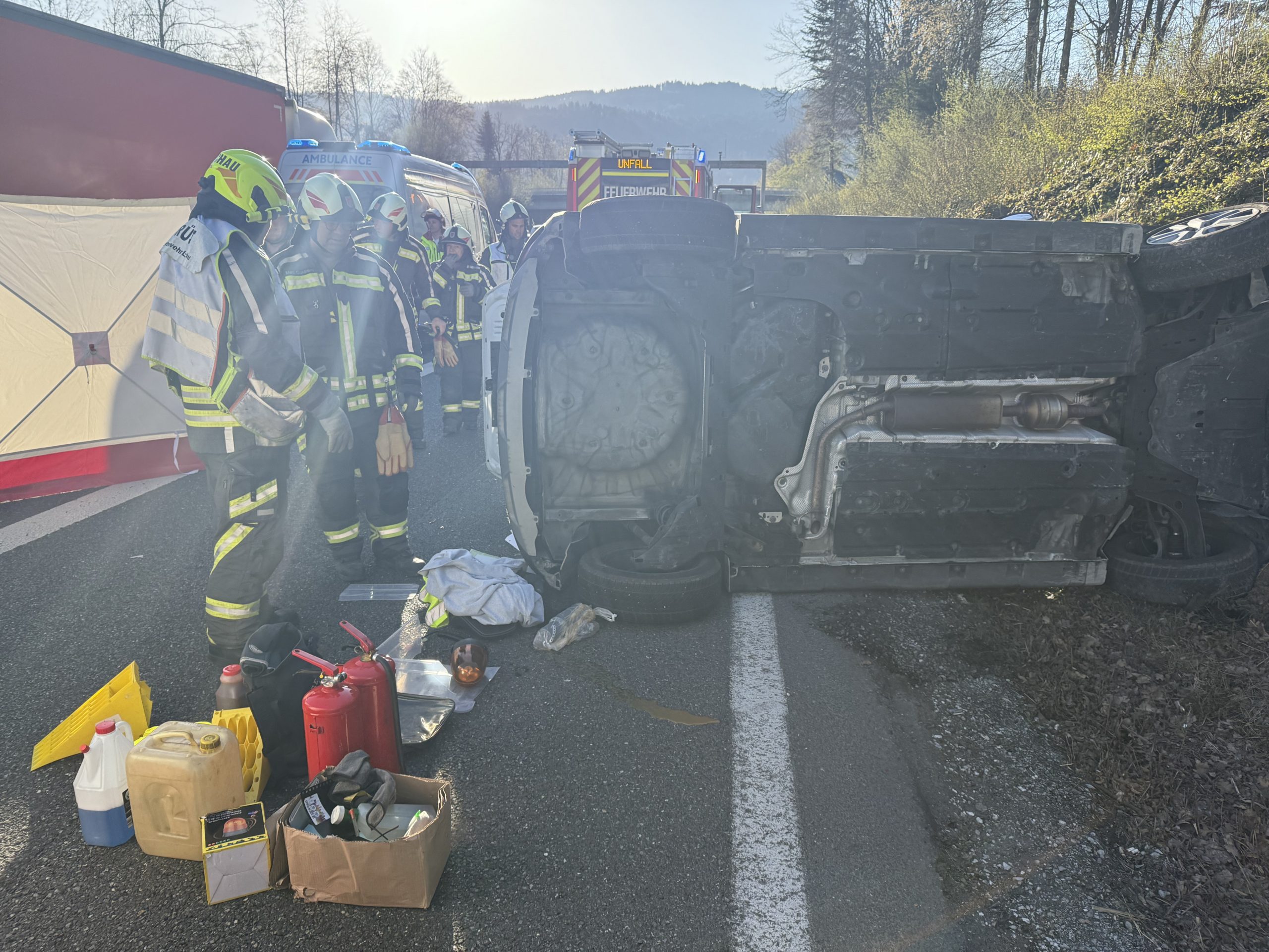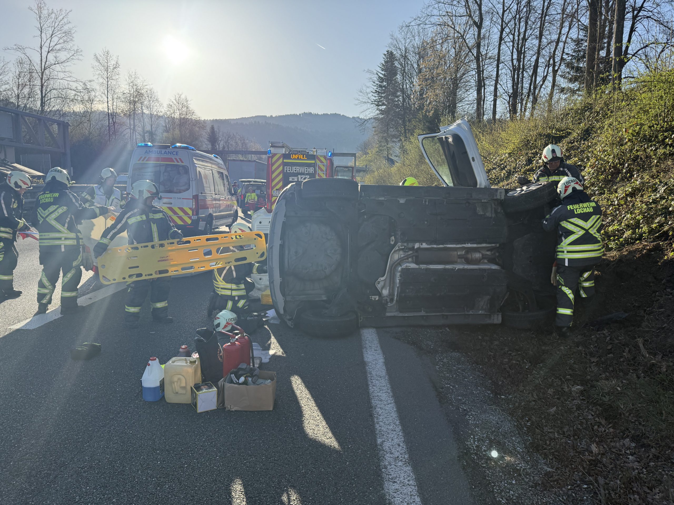 Die Feuerwehr Lochau war mit drei Fahrzeugen und 15 Einsatzkräften vor Ort. Um die Lenkerin aus dem auf der Seite liegenden Fahrzeug zu befreien, öffneten die Einsatzkräfte die Heckklappe und retteten sie über diesen Weg. Die Frau wurde anschließend medizinisch versorgt. Sie erlitt Verletzungen unbestimmten Grades.